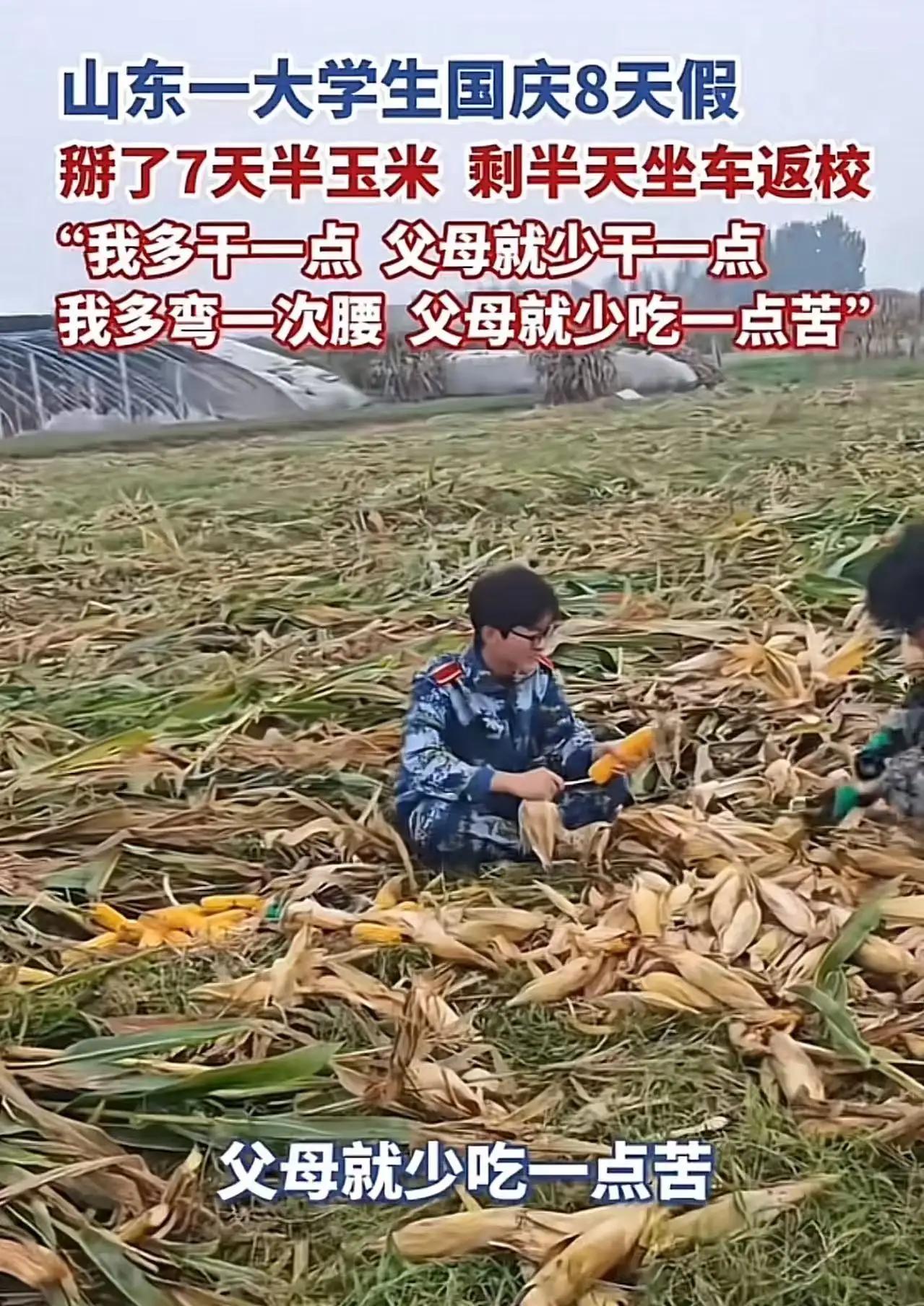 这个山东icon大学生火了!山东,男孩国庆icon8天假,掰了7天半玉米,剩半天坐车返校!他说:”,我多干点儿,父母就少干点儿,我多弯一次腰,父母就少吃一点苦!”网友:这样的孩子长大了肯定有担当有责任,肯定会幸福的。父母会少了很多辛苦! 这位山东的“icon”大学生火了,不仅仅因为他勤劳的身影,更因为他那份朴实无华的孝心和责任感,瞬间点燃了无数人的心。这一幕,仿佛在告诉我们:在快节奏、功利化的社会中,真正打动人心的,永远是那些简单而纯粹的善良。 他叫李明,一个普通的农村孩子,平凡得像一颗沙粒,但他的行动却像一股清流,冲刷着我们心中那些浮躁和浮华。国庆假期,他没有选择旅游、聚会,而是用“掰玉米”的方式,换来了一份沉甸甸的责任感。他说:“我多干点儿,父母就少干点儿,我多弯一次腰,父母就少吃一点苦。”这句话简单,却深刻地揭示了一个孩子对家庭的理解和担当。 很多人或许会觉得,这只是一份普通的假期劳作,但我更愿意看到,这是一个年轻心灵对家庭、对父母最真挚的回馈。在这个快节奏、压力山大的社会,许多年轻人逐渐迷失在“追求更好的生活”中,却忘记了最初的初心。而李明用实际行动告诉我们:责任,从不分年龄,只要心中有爱,就能成为改变的力量。 网友们纷纷点赞:“这样的孩子长大了,肯定有担当有责任,肯定会幸福的。”的确,责任感像一颗种子,只有在心中生根发芽,才能长成参天大树。而李明的故事,恰恰是最好的注脚:一个普通的孩子,用行动诠释了什么叫“责任与担当”。 更令人动容的是,李明的父母没有责怪,没有要求,只是默默地看着他,用最朴实的笑容回应。那一幕,仿佛在告诉我们:最好的教育,不是嘴上说教,而是用行动去传递温暖和力量。 这件事,也让我们反思:在这个物质充裕、竞争激烈的时代,是否我们也应该像李明一样,学会用心去感受生活的点滴,用行动去传递爱与责任?或许,社会需要的不仅仅是金钱和成功,更是像李明这样有温度、有担当的年轻人。 其实,李明的故事还在继续。他的行为或许微不足道,但背后蕴含的价值,却是无价的。每一个家庭、每一个社会,都需要这样有责任感的年轻人去点亮未来的希望。因为,只有当我们每个人都愿意多付出一点点,社会的温度才会升高,幸福的光芒才会照亮每一个角落。 最后,或许我们每个人都可以从李明的故事中找到共鸣。我们是否也曾在忙碌中忽略了父母的辛苦?是否也曾在追求梦想的路上忘记了最初的初心?也许,只要我们多一点善意、多一点责任,就能让这个世界变得更加温暖。 这,就是一个普通孩子用行动书写的非凡故事。期待未来的日子里,有更多像李明一样的“icon”,用他们的行动,让爱与责任在社会中生根发芽。因为,幸福,从来都不是遥不可及的梦想,而是我们每一个人用心去践行的平凡伟大。大学生回村干活
