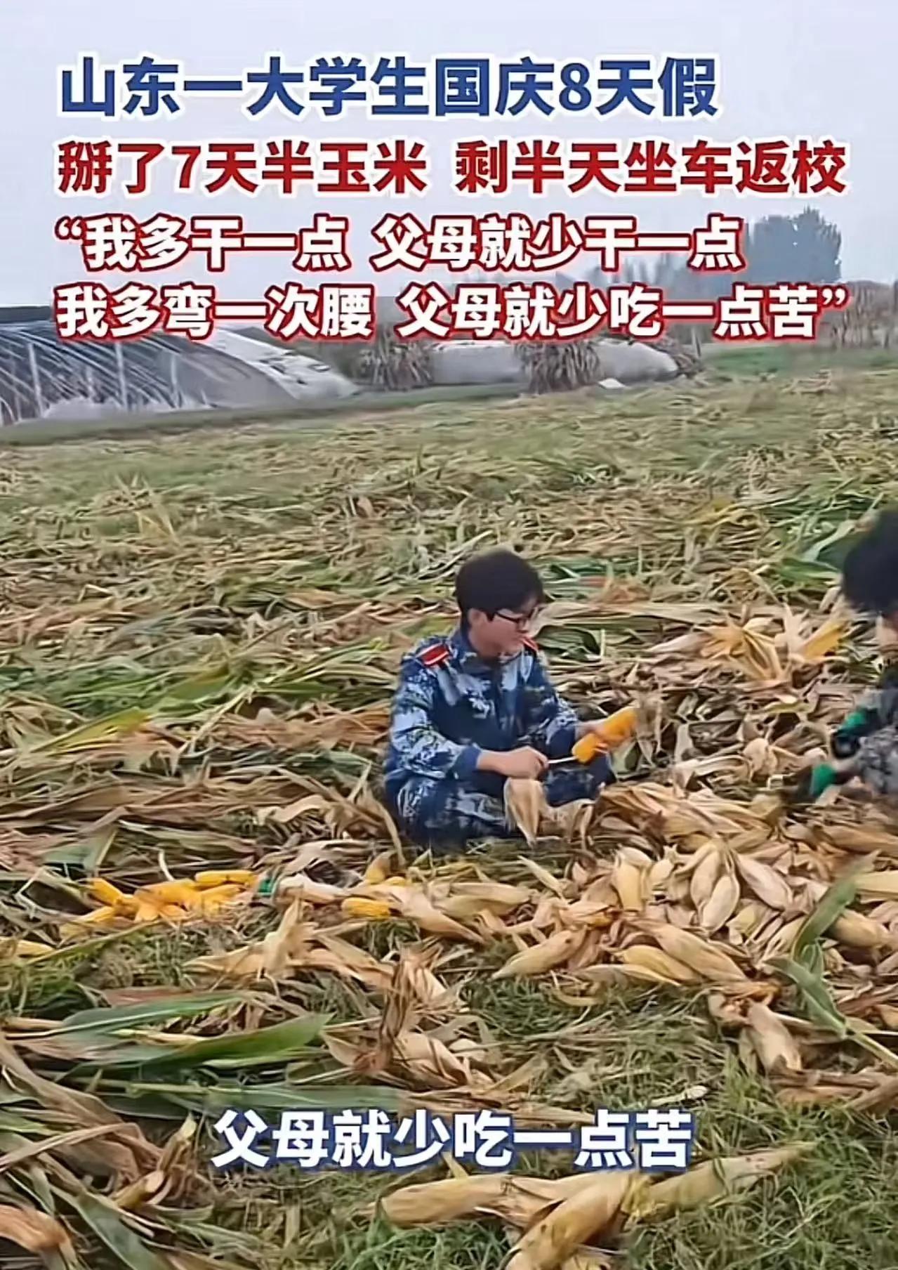 这个山东ICON大学生火了!他用一句朴实又暖心的话,瞬间打动了无数人的心:国庆8天假,他只用了7天半的时间“掰玉米”,剩下半天,匆匆忙忙坐车返校。有人或许会觉得他“浪费时间”,但更多的人却被他背后的故事感动得热泪盈眶。 他说:“我多干点儿,父母就少干点儿,我多弯一次腰,父母就少吃一点苦。”这简单的一句话,折射出一个年轻人对家庭的深厚情感,也展现出他那份朴实无华的责任感。在这个快节奏、压力山大的时代,能有这样一份懂得“以自己微薄之力减轻父母负担”的心,实在难能可贵。 网友们纷纷点赞:“这样的孩子长大了,肯定有担当有责任,肯定会幸福的。”的确,一个懂得感恩、懂得付出的年轻人,未来一定会有更宽广的天地。或许有人会说:“这只是个小事”,但正是这些点滴的善良和责任感,才组成了一个温暖的社会。每一个愿意为家人付出一点点的人,都会让家庭变得更加幸福,也让社会变得更加美好。 更令人感慨的是,这个男孩的行为,折射出当代青少年的一种责任意识。在物质丰富、快节奏的生活中,他没有被“享乐主义”冲昏头脑,而是选择用实际行动表达孝心。这种精神,值得我们每个人学习。 或许,很多成年人在忙碌的生活中,早已忘记了那份纯粹的感恩和责任。而这个年轻的“乡村少年”用行动告诉我们:孝顺,不一定是大礼大礼,而是点滴的坚持和付出。正如他所说,“多干点儿,父母就少干点儿”,其实,最简单的幸福,就是让父母少一些操劳,多一些安宁。 这个故事也让我们反思:在现代社会,家庭的温暖和责任感依然是不可或缺的底色。无论我们身处何方,无论未来多么不可预测,只要心怀感恩,愿意为家人付出一点点,幸福就会在不经意间悄然降临。 朋友们,你们怎么看?是不是也被这个年轻人的孝心感动了?在这个快节奏的时代,或许我们都应该学学他的“弯腰”精神,让爱与责任成为我们生活中最温暖的底色。毕竟,幸福其实很简单,就是一家人平安、健康、温馨的陪伴。孝心大学生 家庭