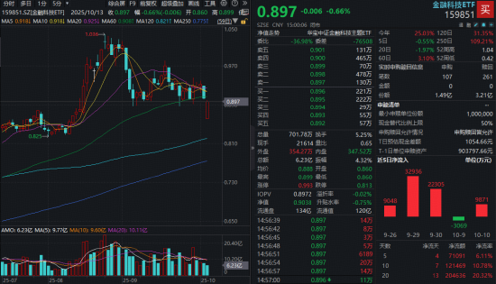 热门ETF方面,同类规模超百亿、流动性断层第一的金融科技ETF(159851)场内低开4.76%下探至近2个月低点,随后快速回升,收盘微跌0.66%,日内情绪大回暖,全天缩量成交6.23亿元。资金近期连续加码,金融科技ETF(159851)近20日吸金超20亿元。