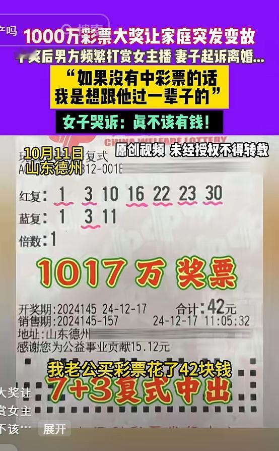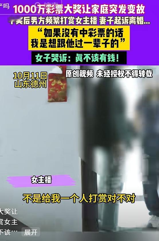 “男人有钱就变坏?”山东,一男42元买彩票,竟中奖1000多万,税后到手814万元,男子钱到手后,给妻子一张空卡,称里面300万,之后每天打麻将、打赏女主播,对妻子却一毛不拔,妻子心凉了,查清手里是个空卡后,对男子彻底寒心了! “他真不该有钱!” 10月10日,女子在记者面前哭诉,自己的丈夫自从中了千万大奖后,仿佛变了一个人。 2024年,丈夫买彩票中奖了,他是多年老彩民,中奖后,他当天就表示给妻子钱。 还说以后让她跟着自己过好日子,神秘兮兮的给妻子一张卡,说里面有200万,是给妻子的养老钱。 妻子感动不已,把银行卡收了起来,想着两人有钱了,以后养老也有着落了,可丈夫却渐渐变了。 他经常刷女主播的直播间,大方打赏,还和女主播见面,妻子颤抖着手,拍下他和女主博弈一起下车的画面。 妻子气愤的冲上去和女主播对峙时,对方却说,自己这么年轻,怎么会找她老公,他就是自己直播间的大哥,两人没有见不得人的关系。 不仅如此,妻子还发现,他带别的女人外出旅游,吃喝玩乐花的都是丈夫的钱。 妻子找丈夫对峙时,他也不愿承认,妻子一气之下,还把他起诉了,提出了离婚。 丈夫也是气势汹汹,叫嚣着法庭上再见,双方不欢而散。 “如果不是他中了彩票的话,我想跟他过一辈子的!” 妻子气愤大哭,她没想到,自己和丈夫多年来感情都很好,他怎么一有钱,就全都变了。 妻子一开始没有想跟他较真,想着他之前给了300万的养老钱,拿着这笔钱,即使分开了,自己的生活也能有个保障,可等她到银行查了余额,瞬间气炸了,上面一分钱都没有,丈夫中奖的地3天就把钱全取走了,给她的根本就是个空卡! 妻子的信念瞬间崩塌了,原来在他打赏女主播之前,就没打算给她钱,给个卡只是一个安慰剂,可她太单纯了,竟然信了。 她还得知丈夫想让别人生个孩子,自己婚后多年都没生育,丈夫有钱后,想直接越过她,要个孩子了,这让妻子更气愤了。 丈夫理直气壮,觉得自己买彩票中的钱,想怎么花妻子都管不着。 其实婚后中的大奖,算是夫妻共同财产,丈夫没有一个人支配的权利,他至少要分一半给妻子,自己独自挥霍,就太自私了! 有网友表示,如果自己中了奖,第一反应就是给家人添置东西,根本舍不得花到陌生人身上,男子也太拎不清了。 还有一名网友称,自己一年前中了185万大奖,后来花的差不多了,对自己目前的生活没有任何改善。 男子手里的钱不知道剩多少了,但等他花完的时候,可能才会意识到,妻子是最关心自己的。 但他的举动,太让妻子寒心了,等他挥霍一空,想回到妻子身边的时候,她早就不想继续跟他过日子了。 起诉离婚时,法院还会要求男子返还给妻子一部分钱,只是不知道他还能不能拿出来那么多了。 如果你中了大奖,你会如何做呢? (来源:小莉帮忙 2025年10月10日 山东德州,10月11日,1000万彩票大奖让家庭突发变故,中奖后男方频繁打赏女主播,妻子起诉离婚)
