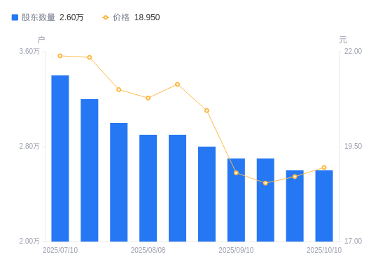 日期A股户数(户)流通A股户均持股数(股)户均持股市值(万元)2025-10-10260007623.7014.452025-09-30260007623.7014.262025-09-19270007341.3413.612025-09-10270007341.3413.812025-08-29280007079.1514.482025-08-20290006835.0414.452025-08-08290006835.0414.202025-07-31300006607.2013.882025-07-18320006194.2513.532025-07-10340005829.8912.76