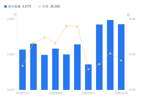 日期A股户数(户)流通A股户均持股数(股)户均持股市值(万元)2025-10-10467059304.6524.662025-09-30468709271.8925.132025-09-19466919307.4424.372025-09-10451129633.2124.802025-08-29459059466.8027.812025-08-20455059550.0228.102025-08-08457339502.4126.582025-07-31454889555.9527.202025-07-18459329463.5726.492025-07-10456999511.8324.76