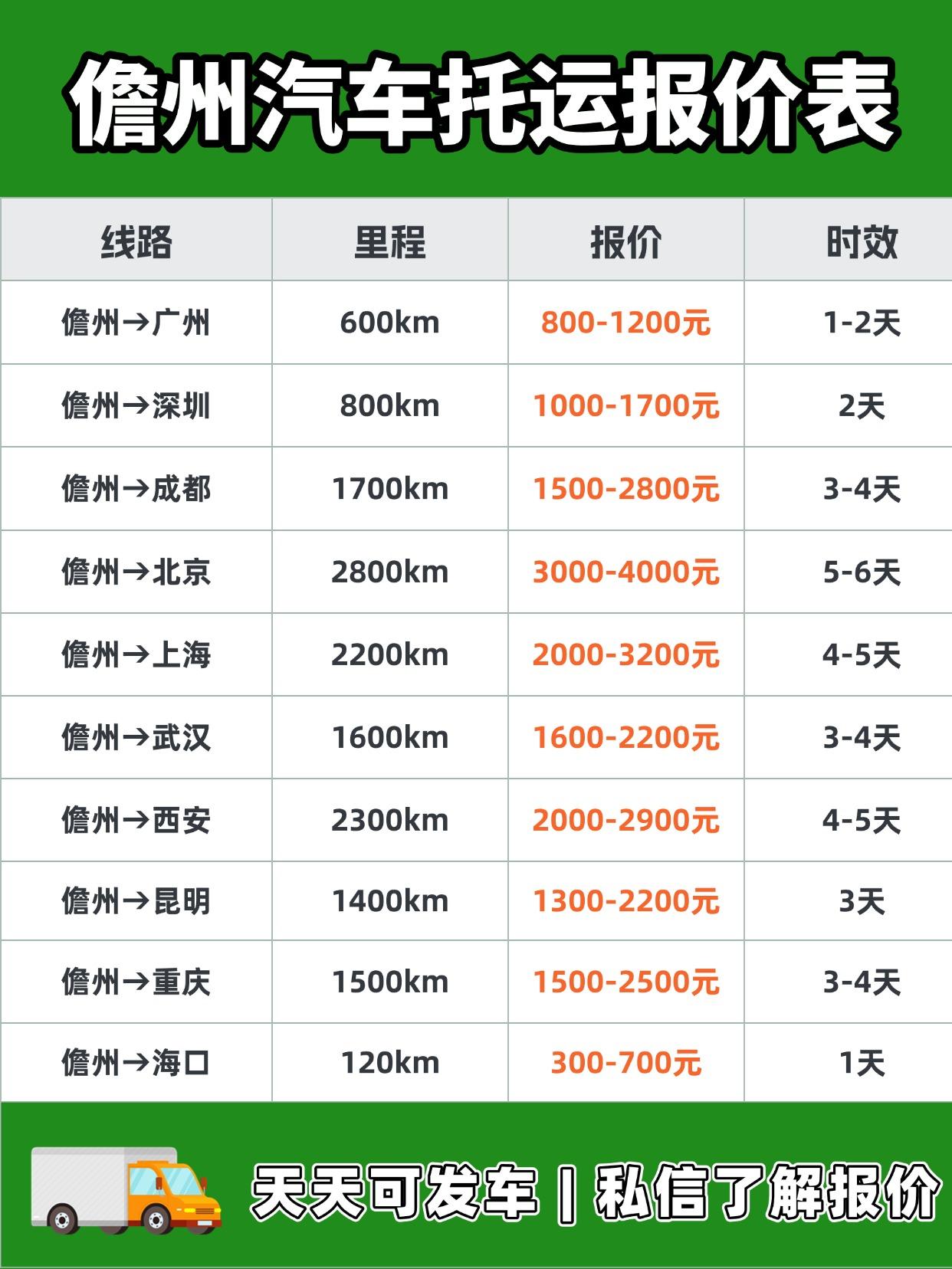 儋州发运汽车收费标准大揭秘 普通家用小轿车从儋州发运,费用一般在1000-8000元之间,具体看目的地城市等级和距离!一二三线城市大概1-1.5元/公里,四五线城市会稍贵些,约2-2.5元/公里。 普通家用车的托运费用大多在1000元至5500元这个区间。比如SUV或中型车会比普通小车贵200-300元,大型车如MPV会加价300-500元。 结算尾款前必做检查!⚠️ 外观360°绕车拍视频:重点看车门、玻璃、轮毂有无划痕/凹陷。 查里程数:对比托运前记录,异常增加立刻报备! 启动测试:听发动机异响,试灯光、空调、刹车。 证件核对:行驶证、保单是否随车到齐。 签收单标注问题:如有损伤,书面写明再签字! 托运出事故怎么办?🚨 重点!选公司时确认这3点! 1️⃣ 是否签正规合同:明确责任划分+赔偿标准! 2️⃣ 是否含独立保险:保额≥车辆现价值!(拒赔“打包险”) 3️⃣ 现场定损流程:事故后48小时内联系保险公司定损,留存证据!