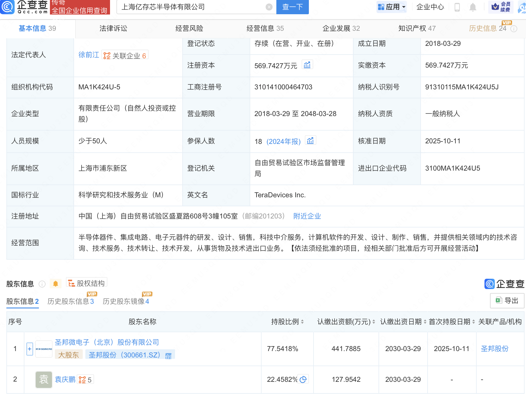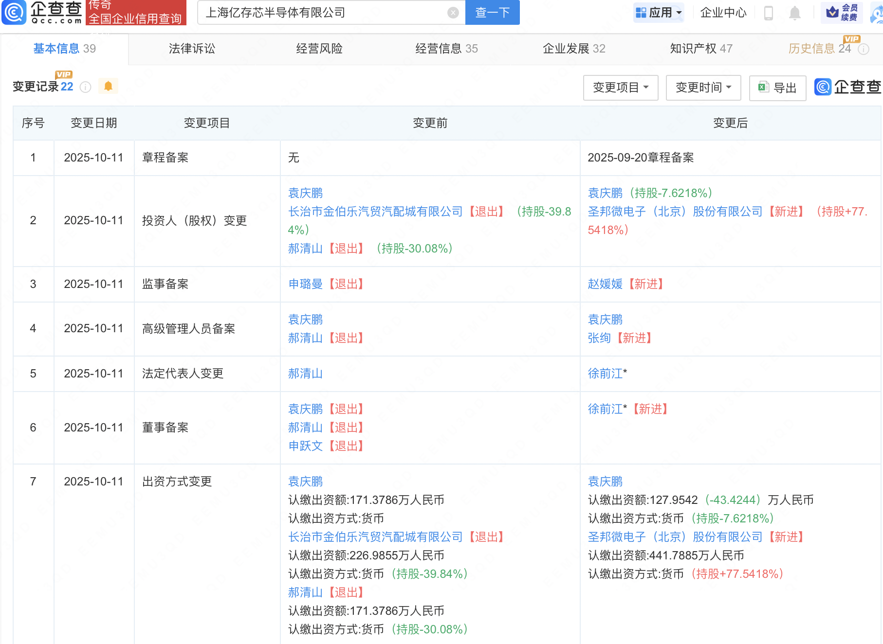 企查查APP显示,近日,上海亿存芯半导体有限公司发生工商变更,原股东长治市金伯乐汽贸汽配城有限公司、郝清山退出,新增圣邦股份(300661)为股东并持股77.54%,同时法定代表人变更为徐前江。企查查信息显示,该公司成立于2018年,经营范围包含:半导体器件、集成电路、电子元器件的研发、设计、销售,科技中介服务等。据其官网,亿存芯半导体是一家芯片设计企业,专注于高性能高可靠性非挥发性存储器、高品质模拟和混合信号产品的研发和销售。