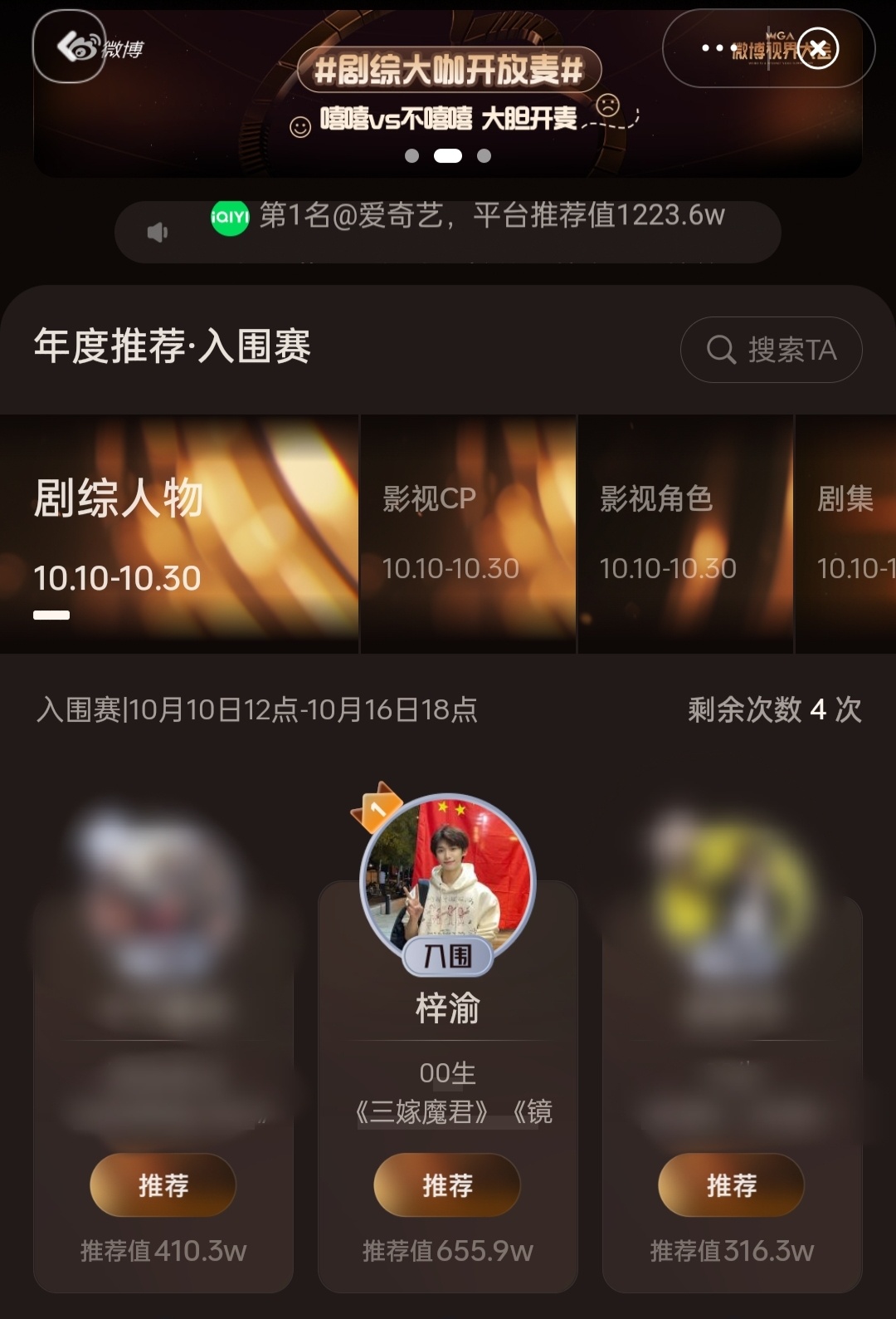 剧综人物推荐值破600w断层第一!各项数据顶顶好太给力了!梓渝剧综人物推荐值破600万
