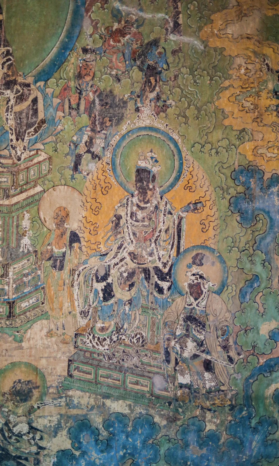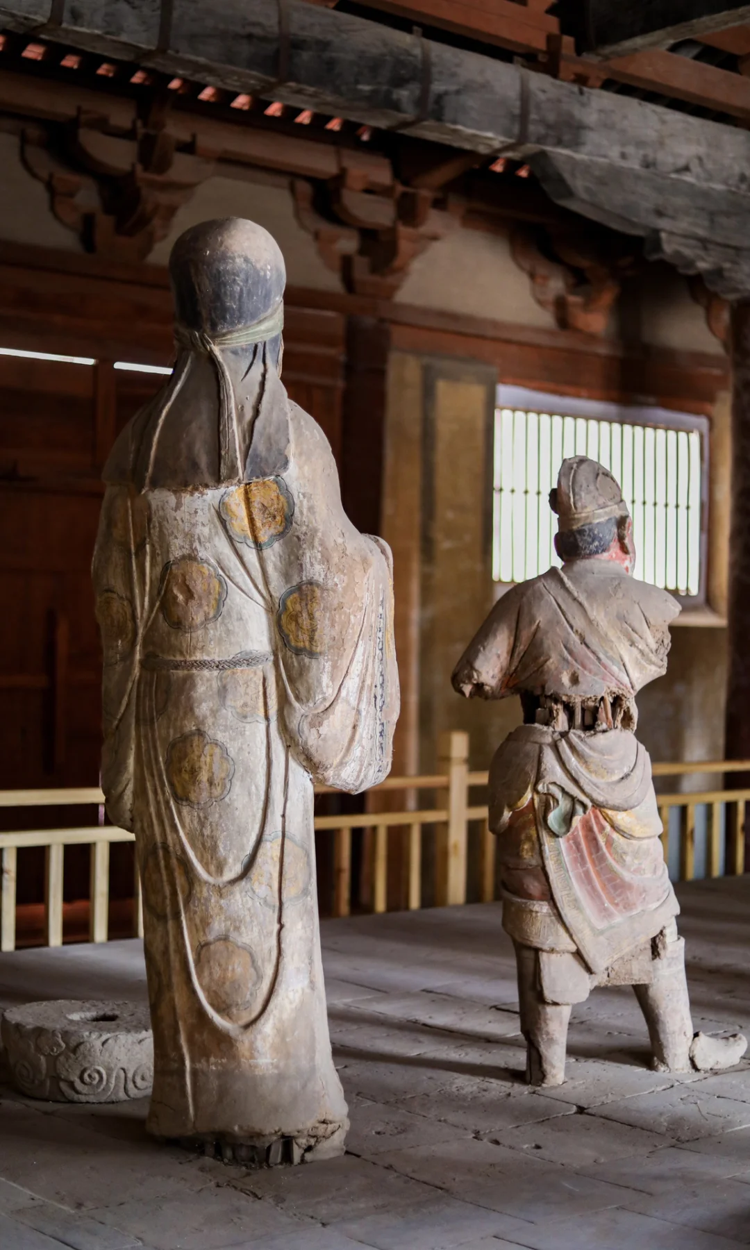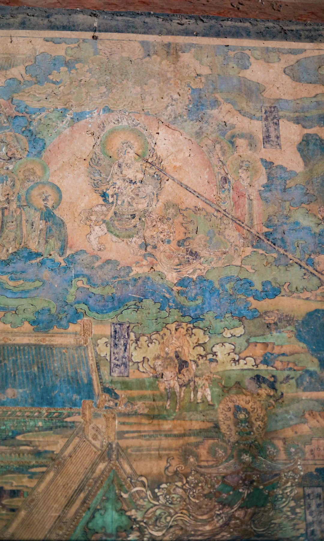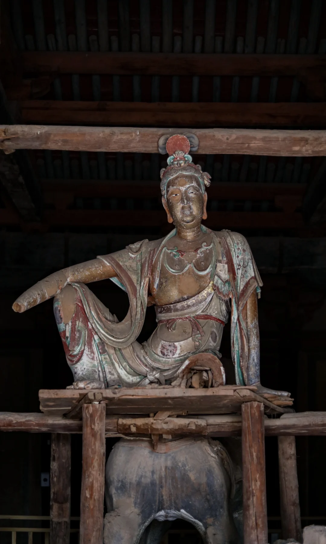 文殊殿面阔五间,进深八椽,单檐歇山顶。主坛上仅存6尊金代彩塑,仅靠几块木条支撑的水月观音残像依旧震撼,而四壁八百年间从未补绘过的稀世壁画保留了金代原貌,弥足珍贵。
