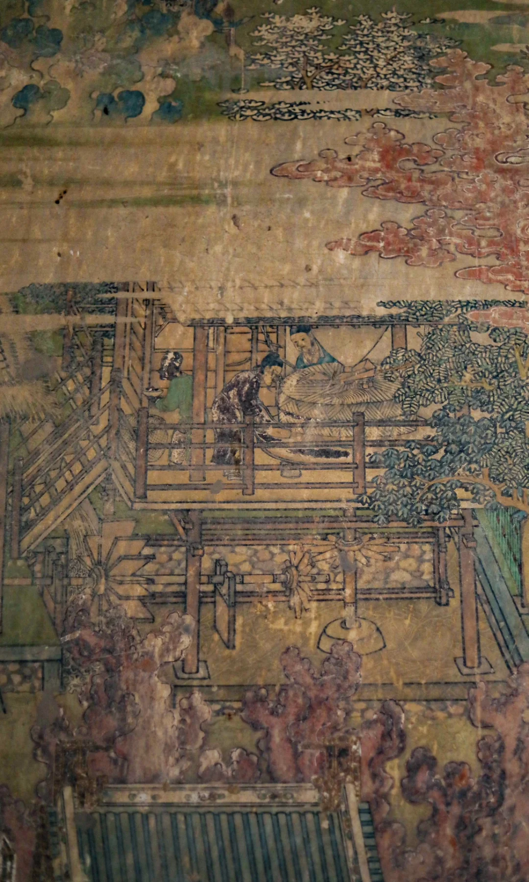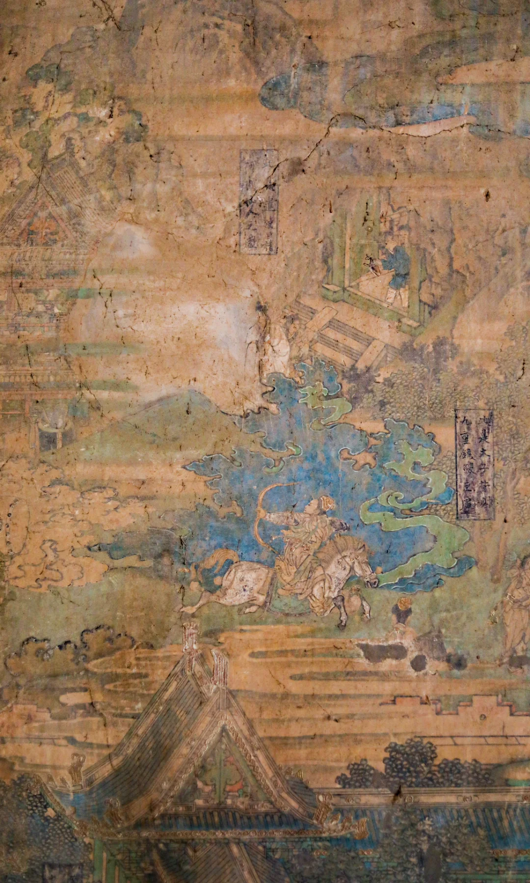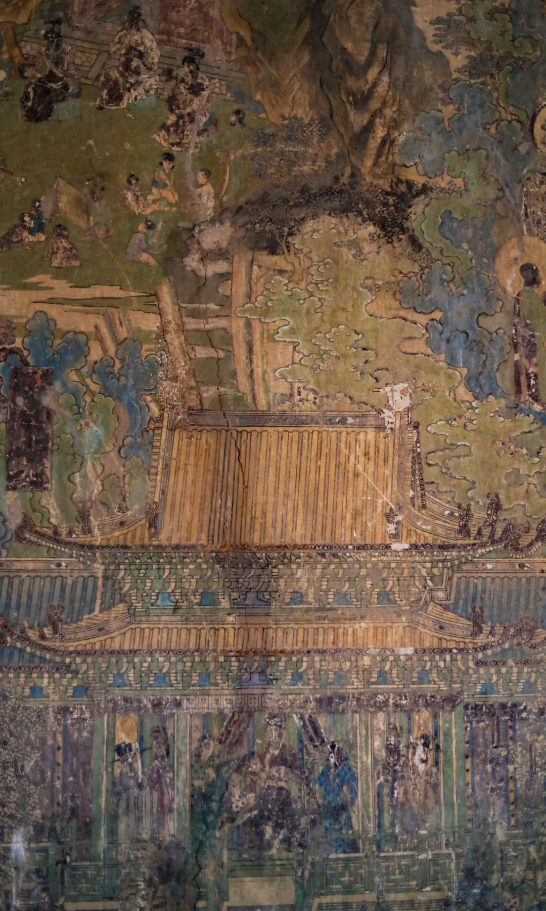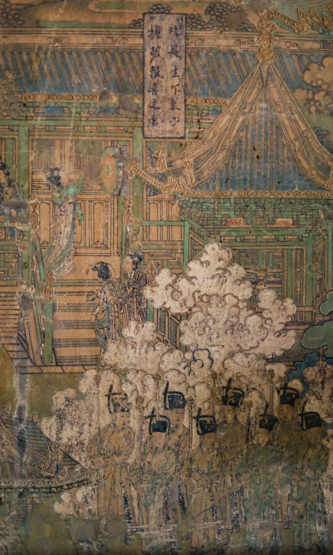金贞元二年(1154年),站在空空如也的岩山寺白墙下,时任御前承应画匠的王逵再次回想起三十多年前靖康之变那个夜晚,昔日北宋都城汴梁的繁华仍旧历历在目。他拿起笔,借本生和佛传故事的骨,附上东京梦华录的皮,把珍藏于心的故国旧都永远留在了文殊殿四壁。彼时距离同朝画友王希孟「千里江山图」的诞生已过半个多世纪,而青绿山水的笔墨在这昏暗的殿里再次也是最后一次回光。