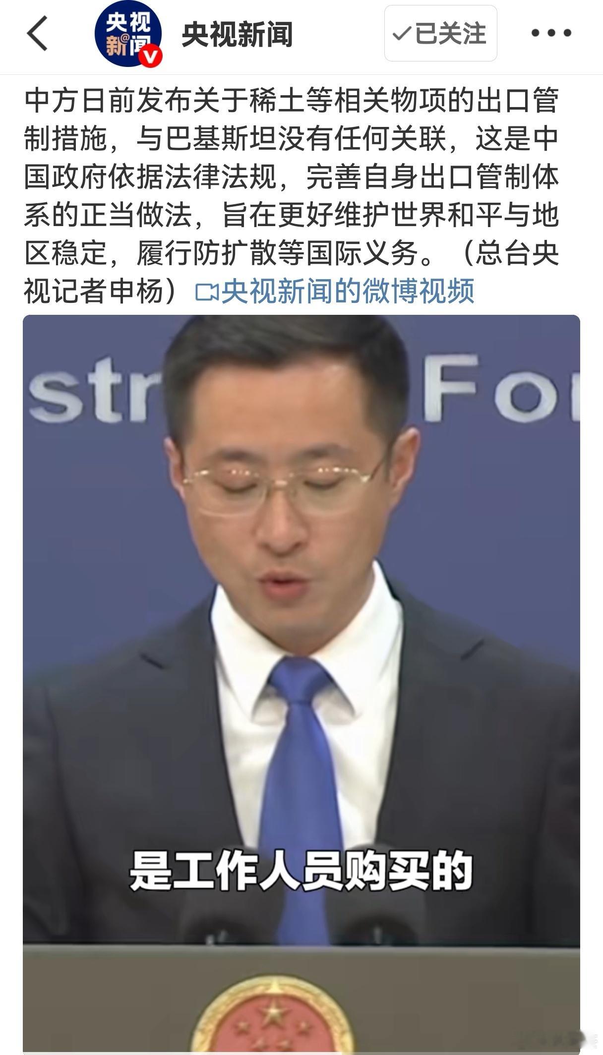 中方日前发布关于稀土等相关物项的出口管制措施,与巴基斯坦没有任何关联,这是中国政府依据法律法规,完善自身出口管制体系的正当做法,旨在更好维护世界和平与地区稳定,履行防扩散等国际义务。