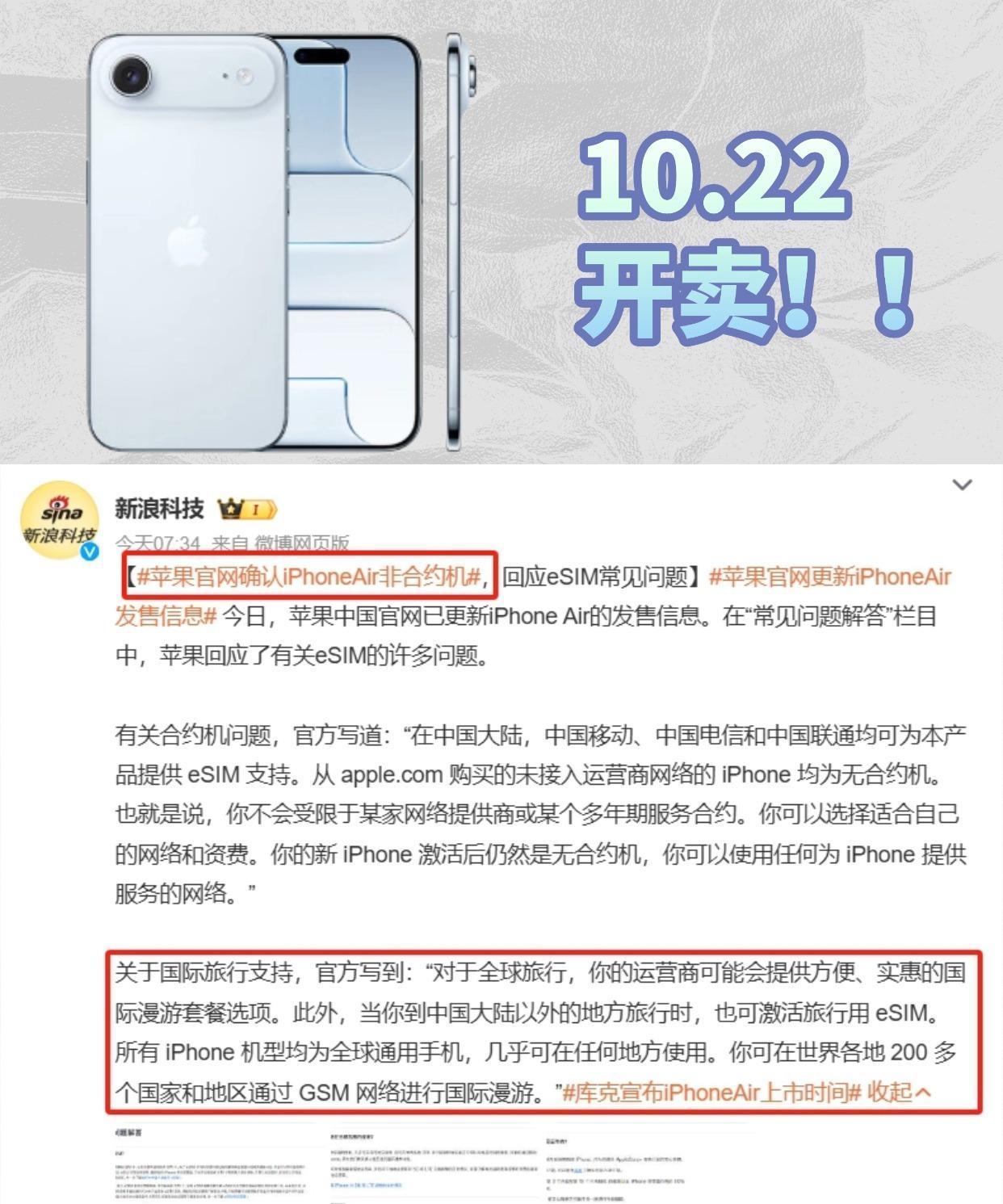 iPhone Air即将在10月22日正式开售,跟国内的联通、电信和移动三大运营