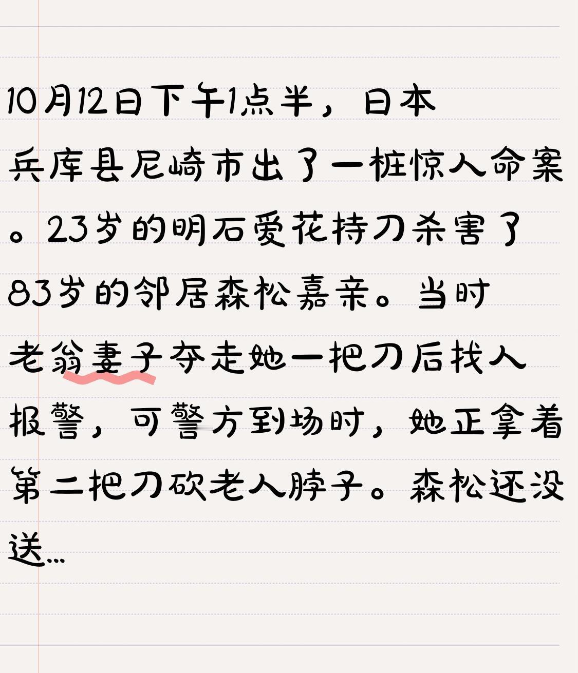10月12日下午1点半,日本兵库县尼崎市出了一桩惊人命案。23岁的明石爱花持刀杀害了83岁的邻居森松嘉亲。当时老翁妻子夺走她一把刀后找人报警,可警方到场时,她正拿着第二把刀砍老人脖子。森松还没送医就宣告死亡,他81岁老伴右手因夺刀被划伤。 这两人平日只是点头之交,案发前也无纠纷或报案记录。明石爱花被捕后承认“意图割喉杀人”,还称“认为必须打倒”老人,显然有预谋,但究竟是精神问题还是邻里隐情,目前还不清楚,实在让人唏嘘。