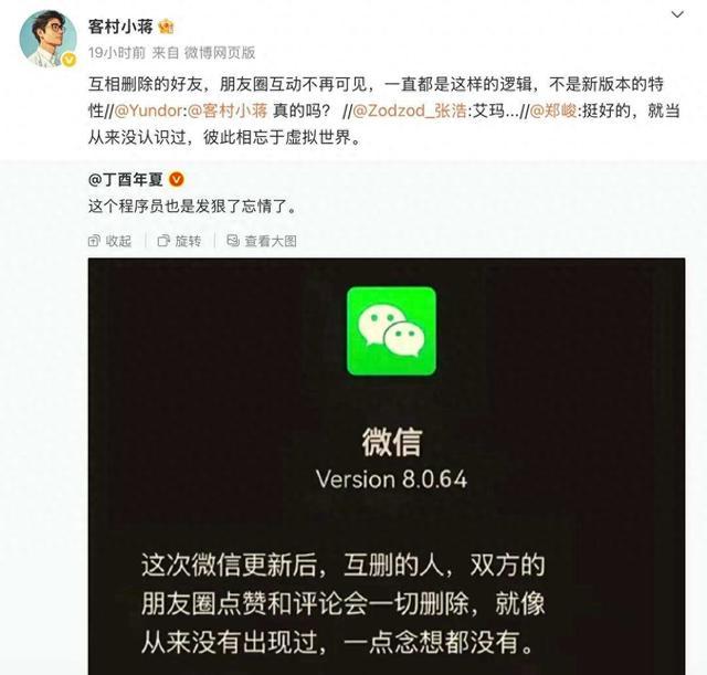 对此,微博认证为微信员工的@客村小蒋转发该网友的推文并表示:“互相删除的好友,朋友圈互动不再可见,一直都是这样的逻辑,不是新版本的特性。”