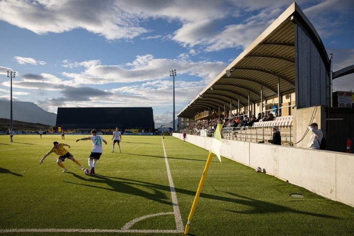 这座球场的每一个角落都散发着独特的魅力。绿茵场如同铺展在大海与天空之间的一块绸缎,三面环海,背靠苍山。当球员在场上奔跑时,他们的身影倒映在北大西洋的深蓝里,仿佛在与整个天地共舞。海鸥的鸣叫、海浪的拍岸声、风的呼啸,与观众的呐喊交织成了法罗群岛足球最独特的交响乐。在这里,每一次传球都要计算风的轨迹,每一次射门都要聆听海的心跳,足球与自然在此达成完美的和谐。