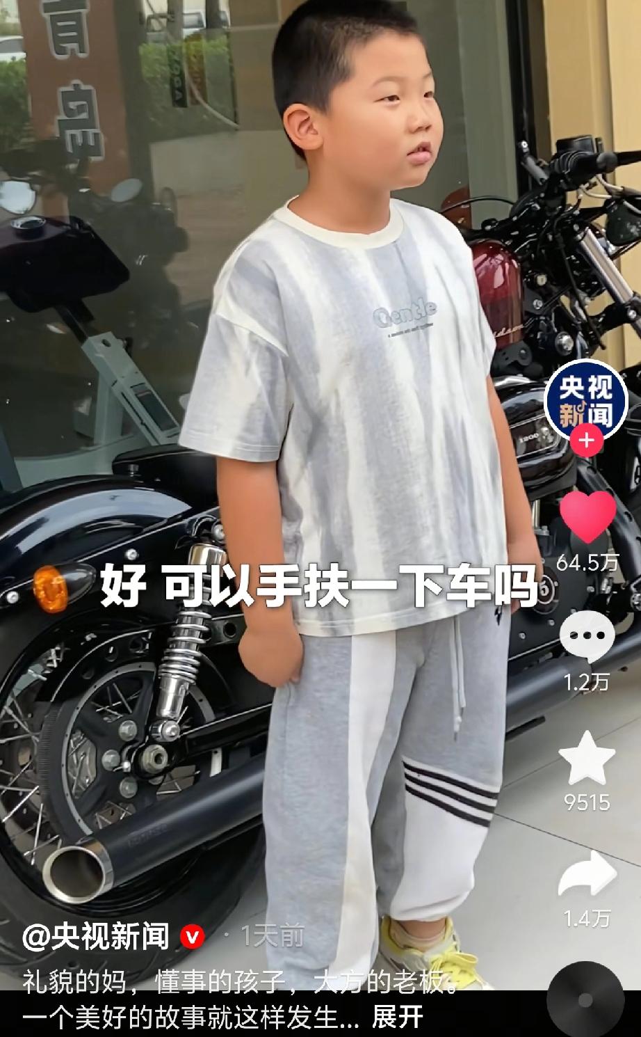“幸福来得太突然了!”山东青岛一对母子骑车经过一家健身房时,结果男孩看到门口停着一辆酷酷的摩托车,由于男孩喜欢摩托车,便让妈妈停下来,想和摩托车合影。然而令他没想到的是车主居然让他坐了上去。 不得不说这对母子也太有素养了吧!孩子下车以后并没有急忙让妈妈给他拍照,而是问妈妈能拍照吗?妈妈也没有自作主张给他拍,让他大胆勇敢的去店里面跟车主询问,可不可以拍照。妈妈礼貌,孩子懂事,谁看了都会同意的。 车主不光同意了,而且还邀请小男孩坐到摩托车上面去,那一刻,小男孩坐在摩托车上又酷又帅。车主很大方,圆了小男孩的梦。 其事也引起网友们热议,妈妈真好,没有任何急躁而是耐心引导孩子主动询问。孩子真好,在妈妈的鼓励下鼓起勇气。这位大哥哥真好,爽快答应并且愉快鼓励孩子随意拍照。美好的人美好的事。 能有这样暖心的一幕,离不开车主的热心。如果车主拒绝了,那么孩子和妈妈肯定会很尴尬,孩子的心理也会受到一定程度的伤害。 母子两个又很有礼貌,很有教养,征得了车主的同意才来去拍照,相信车主也是被母子俩的真情感动了。看出了小男孩是真的喜欢这辆摩托车。 人间自有真情在!相信这一天他们都是开心的,因为他们都做了自己喜欢的事情。 对此你怎么看?