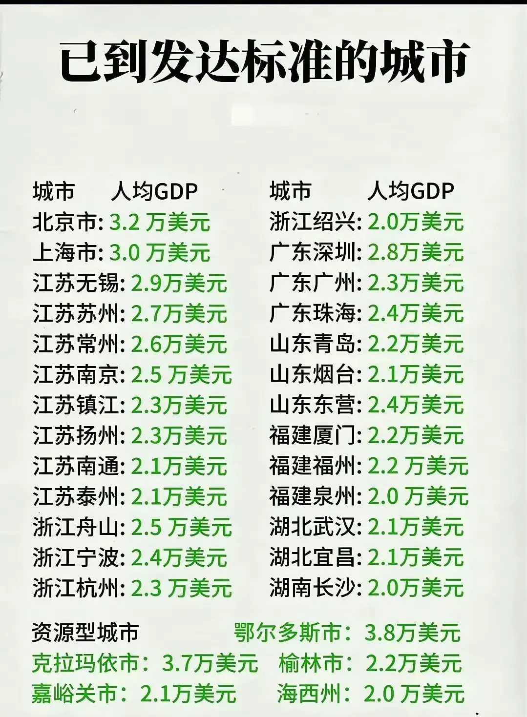 我国已有不少城市达到发达标准。北京作为首都,人均GDP超2.3万美元,城市规划、交通、教育等达国际先进水平,妥妥的国际大都市。上海是经济中心,人均GDP超2.1万美元,产业结构优,基建和城市管理佳。深圳发展迅猛,是富裕之城,人均GDP约2万美元,高新技术等产业厉害。广州是南方经济中心,制造业、商贸等发达。 不过,中国整体还是发展中国家,因为发展不均衡,地区间人均收入差异大,东部和西部发展水平差距明显。