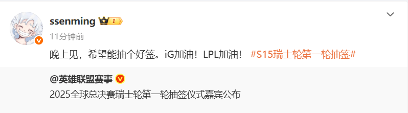 虎扑10月14日讯今日Ming转发瑞士轮抽签嘉宾动态,配文如下: