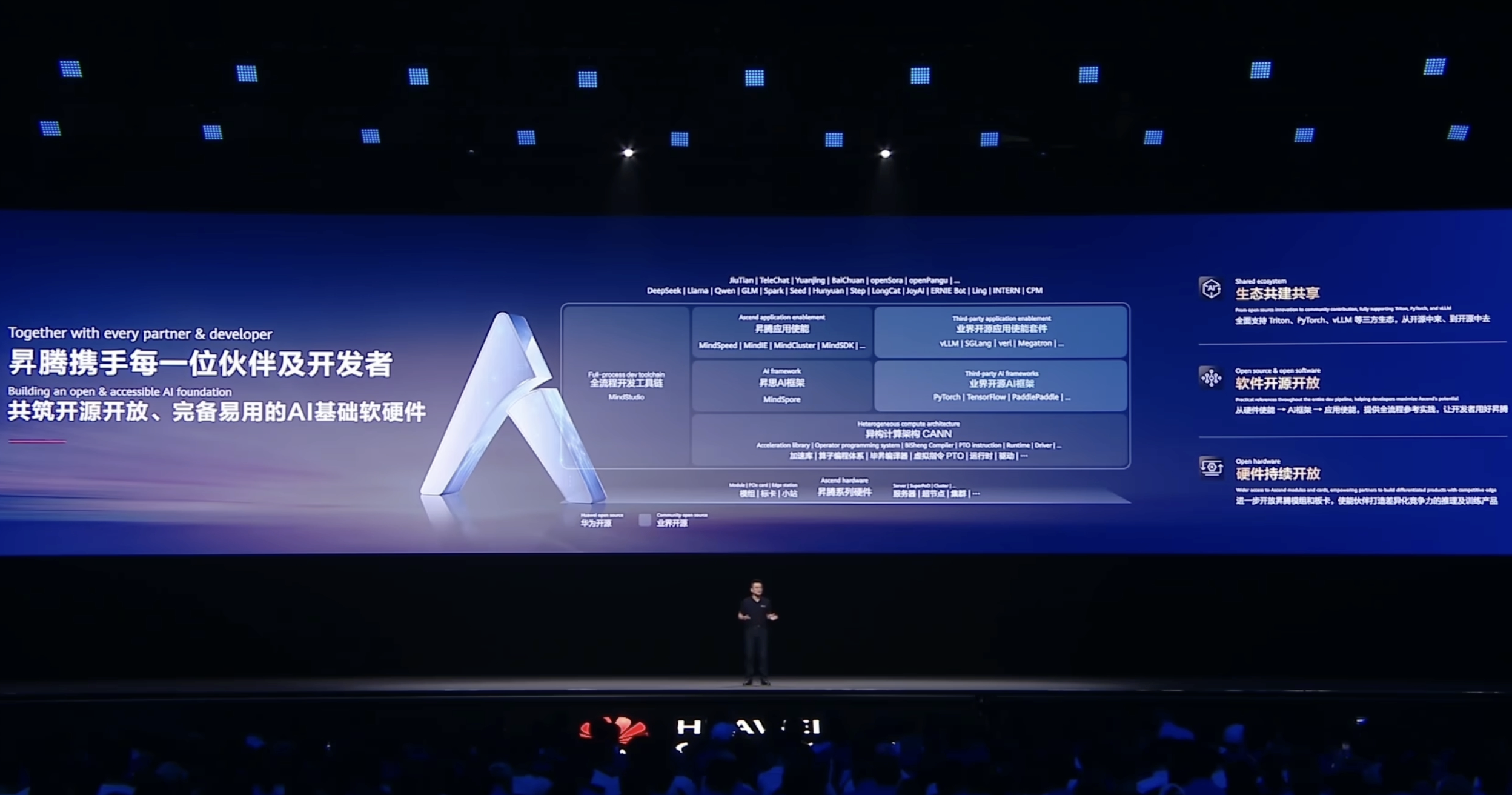 昇腾384超节点自发布以来,累计部署量已突破300套,服务20多家客户,成为大模型基础设施首选。昇腾AI围绕三大方向突破和创新,硬件层面架构创新,打造领先产品,明年超节点规模将突破至8192。
