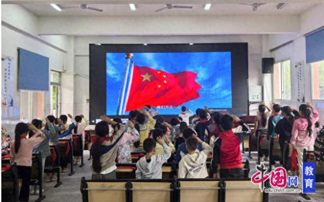 在升国旗环节,全体肃立奏唱国歌,少先队员行队礼,强化爱国情怀,《出旗曲》奏响,队旗飘扬,《中国少年先锋队队歌》歌声嘹亮,仪式氛围庄重热烈。