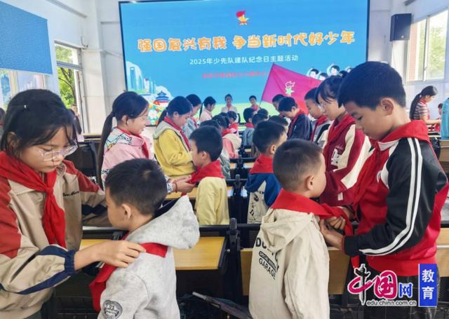 大队辅导员任安会老师宣读新队员名单,老队员代表为新队员佩戴红领巾,新老队员互敬队礼,象征着少先队精神的传承。新队员在队旗下庄严宣誓,“为共产主义事业贡献力量”的誓言铿锵有力。