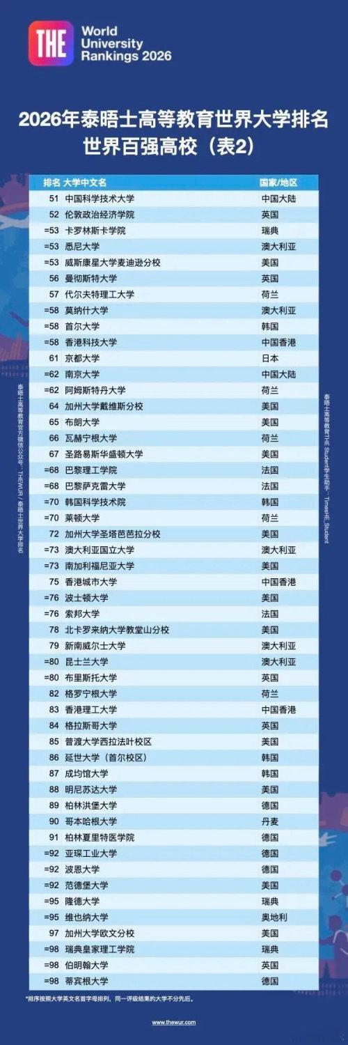 不知道大家怎么看待这次的2026年泰晤士高等教育世界大学排名?(来源:风闻社区)
