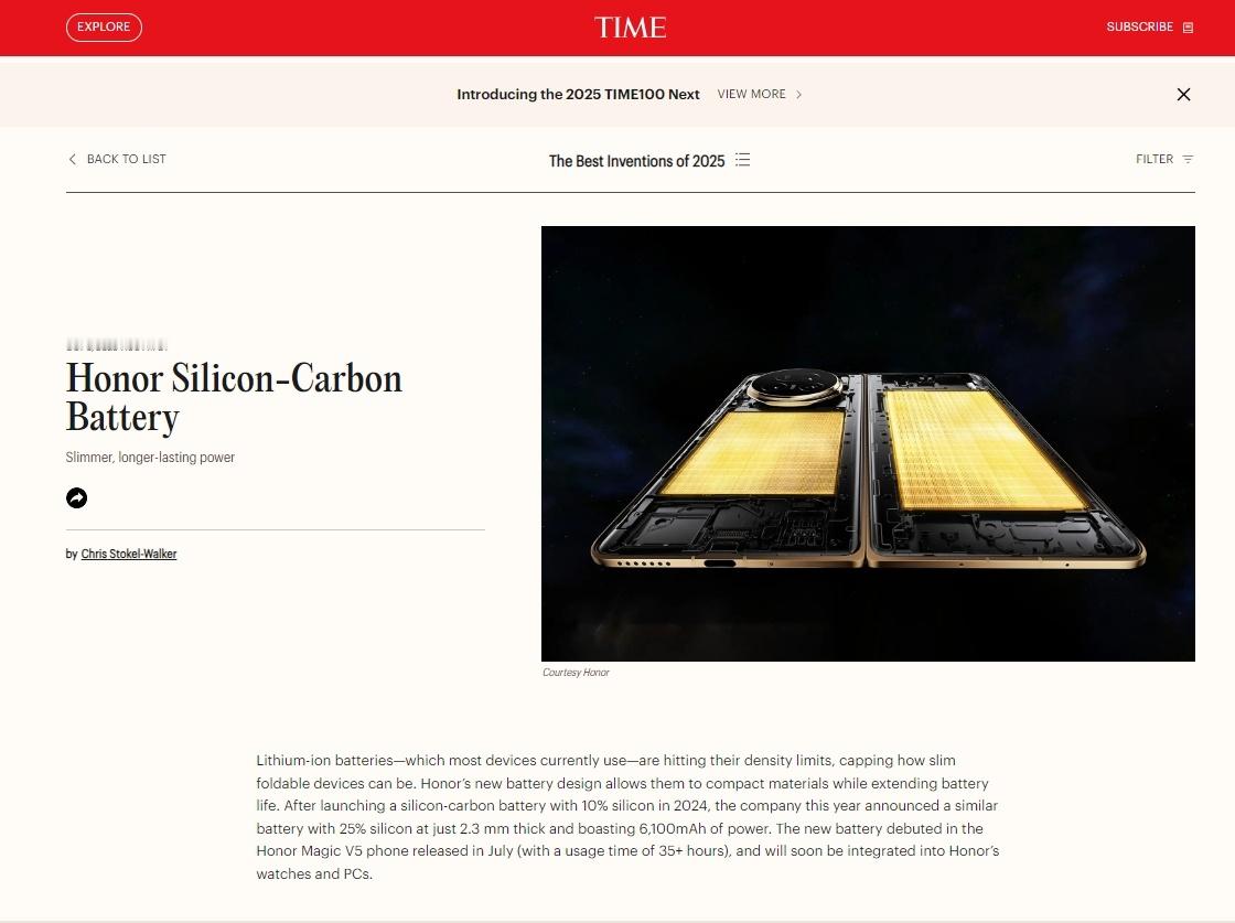 荣耀青海湖刀片电池入选时代周刊最佳发明主榜 荣耀Magic V5搭载的青海湖电池入选《时代周刊》最佳发明榜,国产手机底层技术的一次“双离谱”实力展示。荣耀Magic V5是全球首款实现电池25%硅含量的折叠屏手机,荣耀折叠屏领域的技术硬实力这波牌面拉满[酷]荣耀MagicV5刀片电池入选时代周刊
