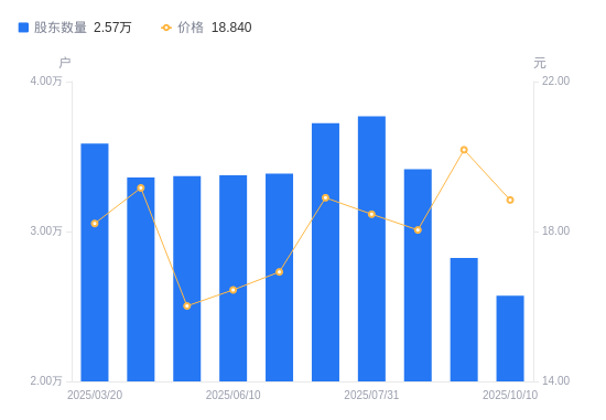 日期A股户数(户)流通A股户均持股数(股)户均持股市值(万元)2025-10-102571914452.5227.232025-09-202823713163.7326.562025-08-203415010884.4619.642025-07-31376899862.4118.212025-07-20372269985.0718.872025-06-303385710978.6518.582025-06-103374811014.1118.112025-04-203369711030.7817.662025-03-313360411061.3121.202025-03-203586110365.1418.88
