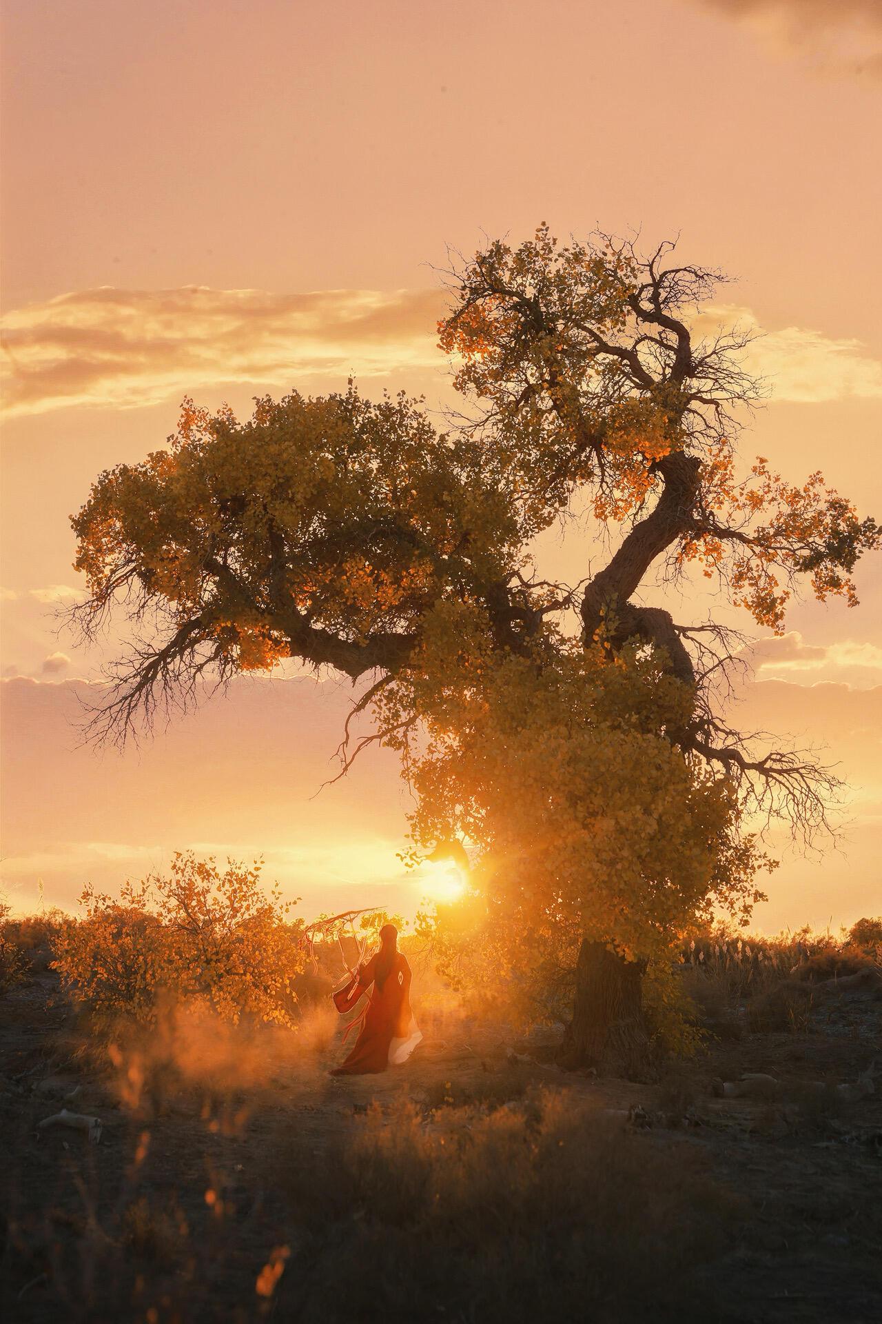 这组深秋环境人像,色彩上的加减法做得极妙。胡杨的金黄是主色调,从浅橙到深黄,层次丰富得像渐变的油画。而人物的红衣是“加法”,是画面的视觉锚点,让观者的目光能迅速聚焦;同时,天空的粉紫、地面的枯褐是“减法”,它们压得住金黄的跳脱,也衬得起红衣的热烈,让整个画面色彩和谐又有冲击力。就像第三张,胡杨的黄一路延伸,红衣在小径上一抹,画面瞬间有了动线,色彩的节奏就活了。 层次的营造也很有门道。前景的枯草、中景的胡杨、远景的山峦(第四张),还有人物在不同景别里的位置,都在构建“近-中-远”的层次。这种层次让画面不是平的,而是立体的,有深度的。比如第四张,胡杨树本身就有黄绿相间的层次,人物倚在树干上,背后还有山峦,眼睛在画面里得“走”一遍,才能看完所有细节,这种层次感带来的沉浸感,让氛围感直接拉满。 情绪的传递也靠这些色彩和层次。深秋本身就带着“萧瑟中的绚烂”的情绪,胡杨的美是壮烈的,红衣的美是炽热的,两者结合,传递出的是一种“在荒芜里绽放,在短暂里永恒”的情绪,这种情绪很打动人,让照片不止是好看,更是有了可以咀嚼的味道。