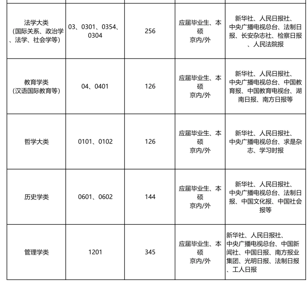 ✅2026媒体单位校招即将开启!本年预计招收1000+ 🎈中央主要新闻单位俗称央媒,共有19家。 1.人民日报社 2.新华通讯社 3.中央广播电视总台 4.求是杂志社 5.解放军新闻传播中心 6.光明日报社 7.经济日报社 8.中国日报社 9.科技日报社 10.人民政协报社 11.中央纪委国家监委新闻传播中心 12.中国新闻社 13.学习时报社 14.工人日报社 15.中国青年报社 16.中国妇女报社 17.农民日报社 18.法治日报社 19.中国文化传媒集团 ✅地方单位涵盖:浙江广播电视集团、浙江日报、浙江电视台、浙江人民广播电台、浙江在线、新蓝网、天目新闻、安徽广播电视台、安徽日报社、安徽新闻传媒集团、安徽电视台、河北广播电视台、河北日报、河北新闻网、河北网络广播电视台、江西省广播电视总台、江西日报、江西电视台、北京广播电视台、天津广播电视台、山西广播电视台、内蒙古广播电视台、辽宁广播电视台、上海广播电视台、江苏省广播电视总台、福建省广播影视集团、山东广播电视台、河南广播电视台、湖北广播电视台、广东广播电视台、广西广播电视台、海南广播电视台等。 ✅招聘专业涵盖所有文科艺术领域,包括但不限于哲学类、经济学类、法学大类、政治学、社会学、马理论、国际关系、教育学类、文学大类、中国语言文学、外国语言文学、新闻传播学、编辑出版学、历史学、艺术学类、戏剧影视学、广播电视编导、动画、设计等。 ✅招聘时间涵盖一整个校招求职季从2025年9月至2026年6月。 ✅笔试内容以行测+新闻实务为主。 🎈战斗即将打响,同学们请做好招聘准备!!