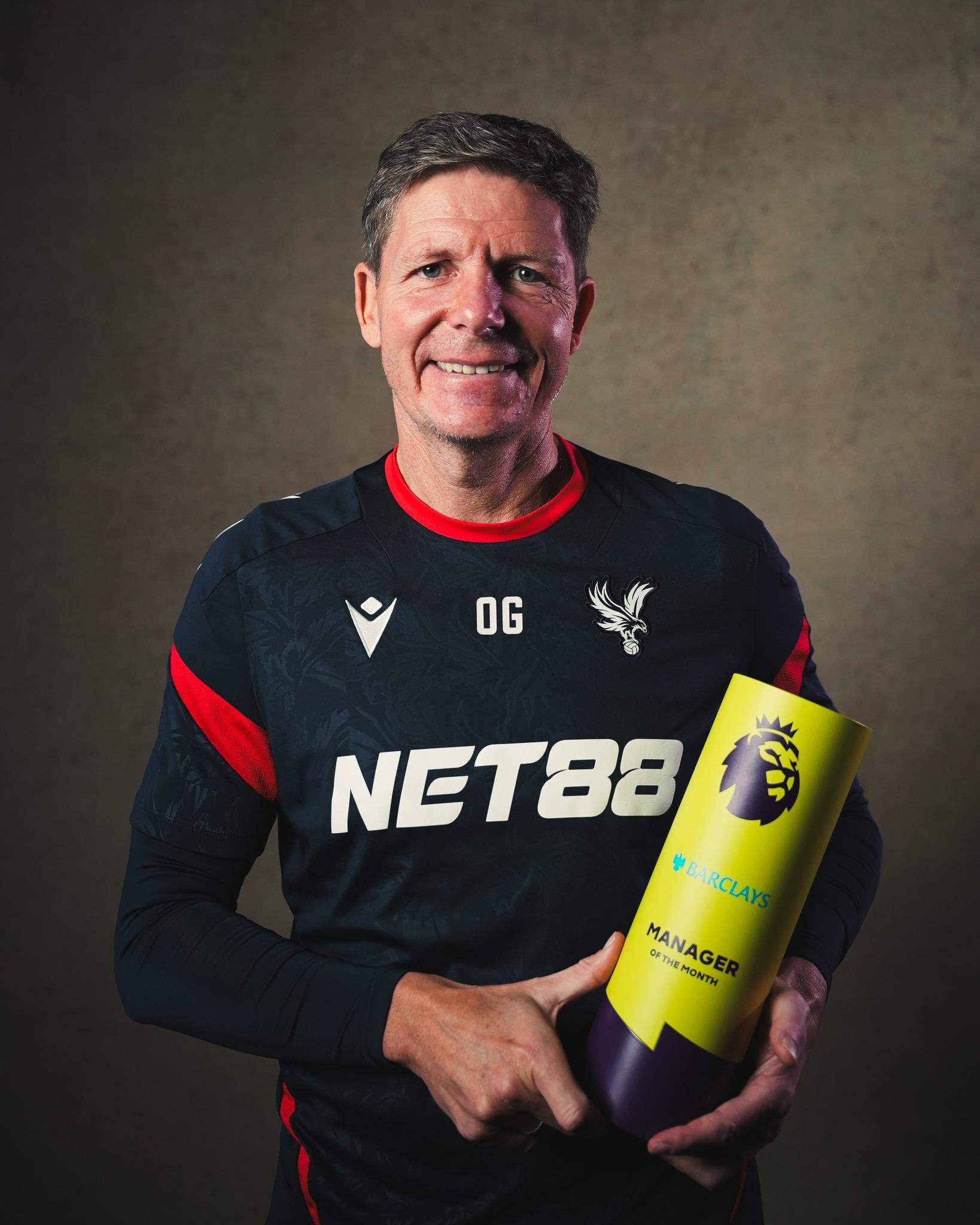 水晶宫官方发布格拉斯纳领取英超9月最佳教练奖杯的照片
