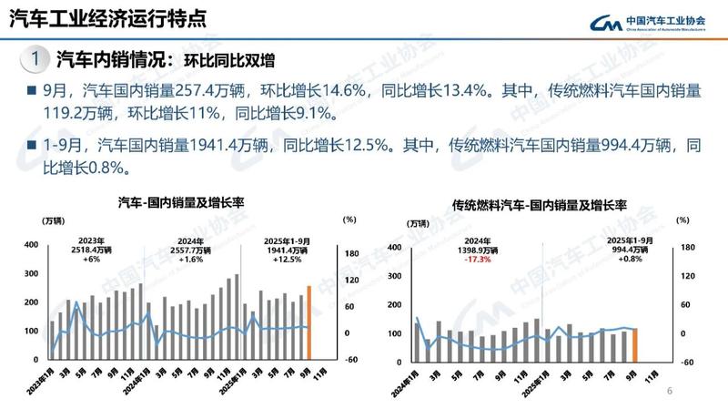 9月,汽车国内销量257.4万辆,环比增长14.6%,同比增长13.4%。其中,传统燃料汽车国内销量119.2万辆,环比增长11%,同比增长9.1%。1-9月,汽车国内销量1941.4万辆,同比增长12.5%。其中,传统燃料汽车国内销量994.4万辆,同比增长0.8%。