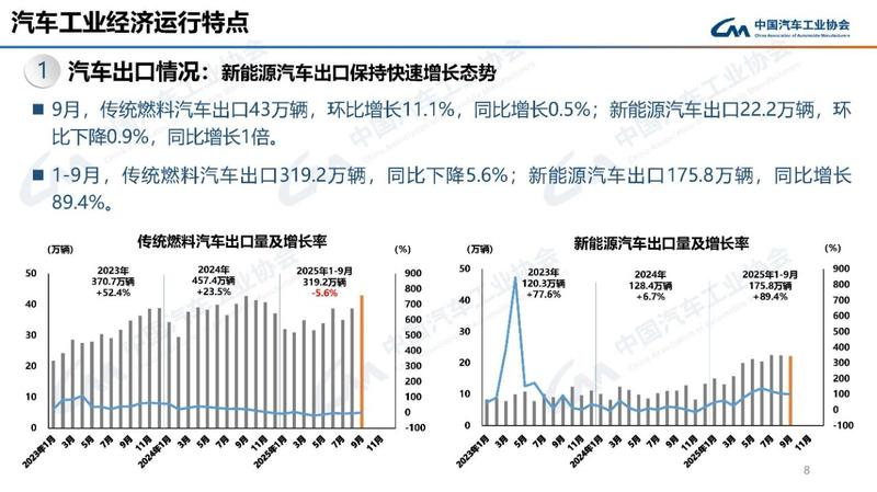 新能源汽车出口保寺快速增长态势。9月,传统燃料汽车出口43万辆,环比增长11.1%,同比增长0.5%;新能源汽车出口22.2万辆,环比下降0.9%,同比增长1倍。1-9月,传统燃料汽车出口319.2万辆,同比下降5.6%;新能源汽车出口175.8万辆,同比增长89.4%。