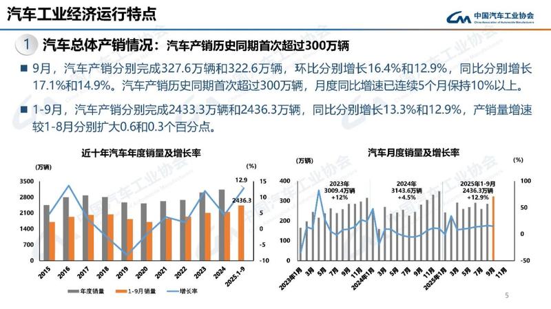 9月,汽车产销分别完成327.6万辆和322.6万辆,环比分别增长16.4%和12.9%,同比分别增长17.1%和14.9%。汽车产销历史同期首次超过300万辆,月度同比增速已连续5个月保持10%以上。1-9月,汽车产销分别完成2433.3万辆和2436.3万辆,同比分别增长13.3%和12.9%,产销量增速较1-8月分别扩大0.6和0.3个百分点。