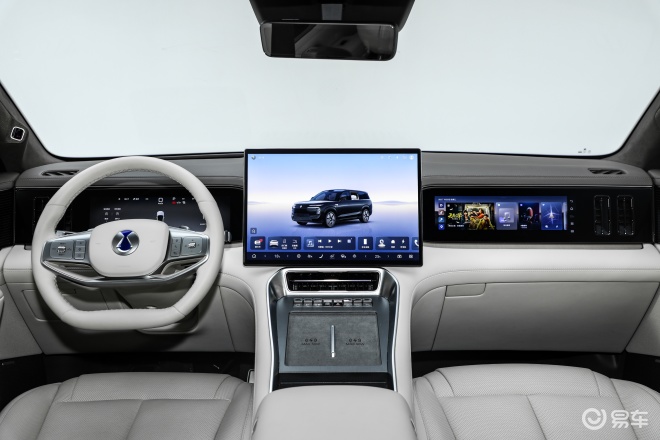 内饰方面,新车延续了家族设计语言,配备了17.3英寸悬浮式中控屏以及13.2英寸副驾屏和液晶仪表,并配备了4纳米制程芯片,并配备全场景语音,支持AI智能体、车载支付、AI语音角色扮演、方言识别等。此外,新车还配备50英寸AR-HUD抬头显示以及3200万像素升降摄像头。新车方向盘为双辐式设计,换挡机构为怀挡。其余配置方面,新车还搭载实体遮阳帘,车载冰箱等配置。