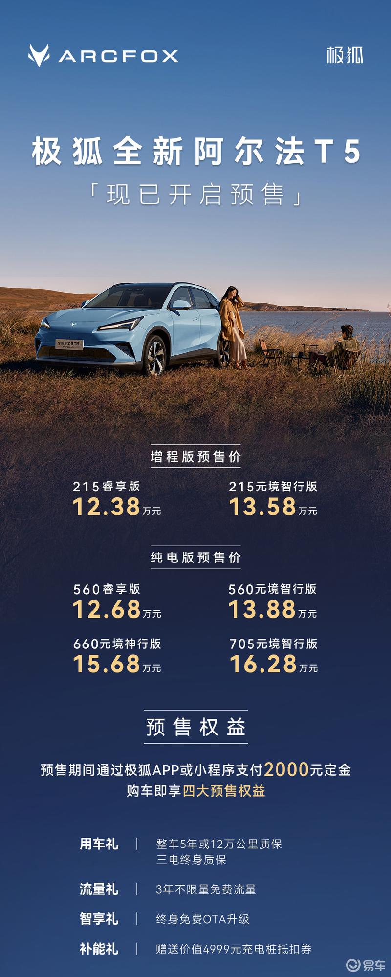 易车讯10月14日,极狐全新阿尔法T5开启预售,增程版车型预售价区间为12.38-13.58万元;纯电版车型预售价区间12.68-16.28万元。官方表示,全新阿尔法T5将于10月底正式上市。