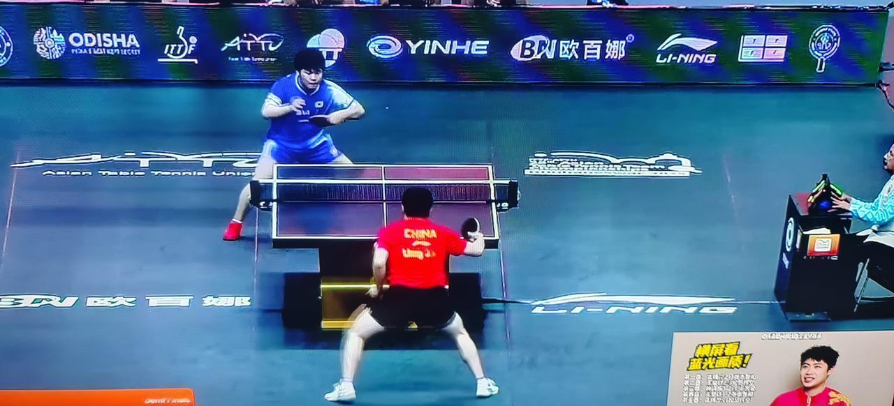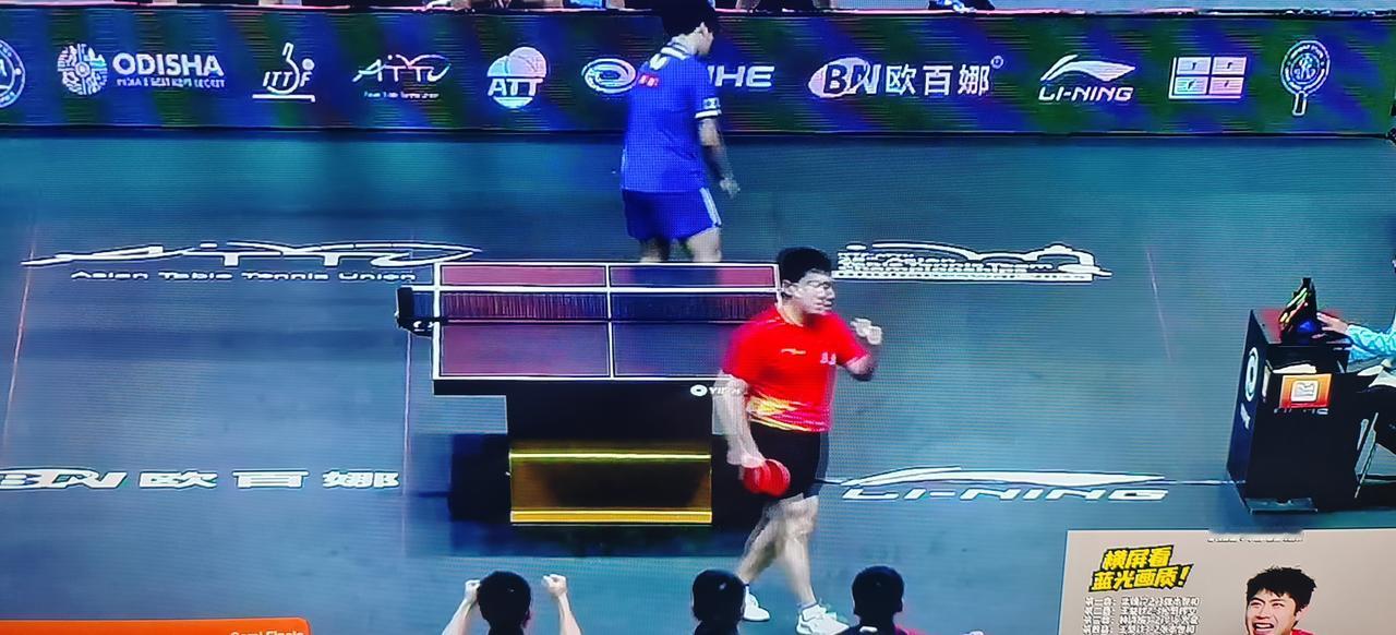 印度亚锦赛,男团半决赛,中国队对日本队,前两盘梁靖崑,王楚钦都是2比3输球,第三盘,第四盘林诗栋,王楚钦各扳回来一盘,将大比分扳成2比2平,第五盘梁靖崑再次上场,对阵日本队松岛辉空,前三局打成1比2,把中国队逼到了悬崖边,第四局梁靖崑奋力拼搏,以11比4将比分扳平,决胜局梁靖崑2比0开局,走势不错,打到3比1,日本队叫了暂停,梁靖崑5比2换边,打到了10比3,最终11比3赢下比赛。甭管胜负,5盘球都打到了决胜局,比赛非常精彩,期待中国队决赛获得冠军。