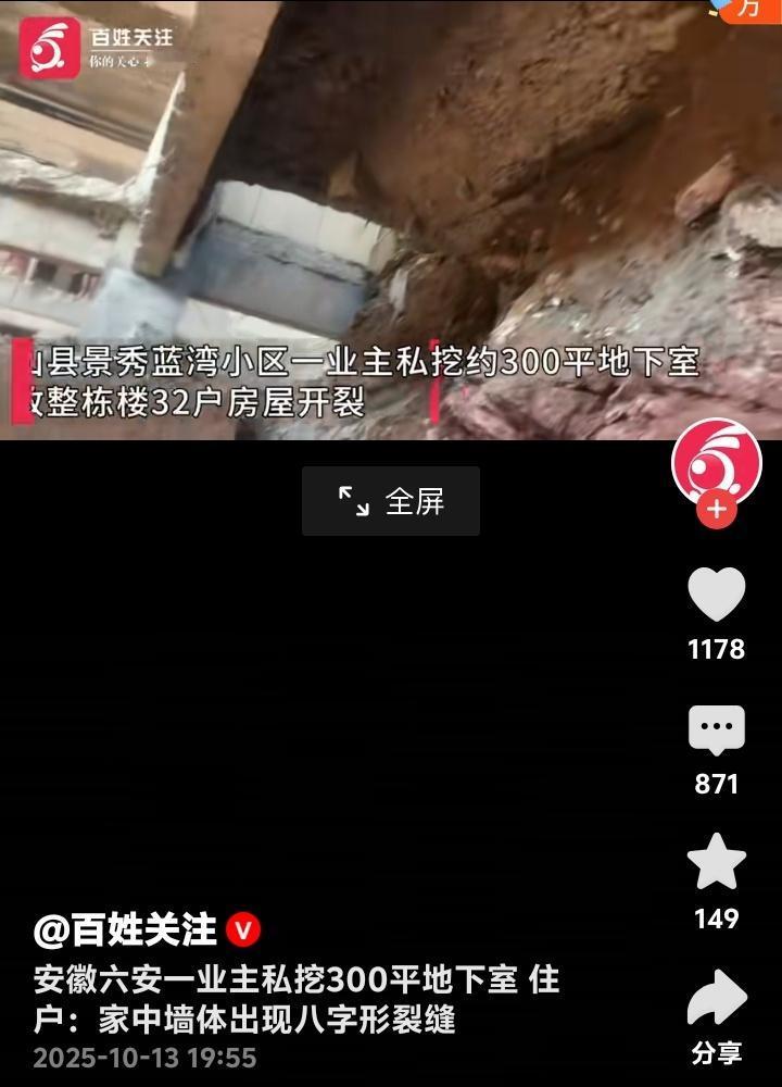 安徽六安业主私挖300平地下室惊动全城!32户墙体惊现八字裂缝,整栋楼摇摇欲坠!真相背后竟藏人性贪婪与安全警示! 当你在家中享受宁静时,可曾想过脚下的土地正被悄然掏空?近日,安徽六安霍山县景秀蓝湾小区的一则新闻引爆全网:一名业主为扩充自家空间,竟私自开挖近300平方米的地下室,导致整栋楼32户房屋墙体开裂,裂缝如狰狞的“八字”爬满墙壁,邻居们夜不能寐,生怕梦中楼塌!这一锤一凿的背后,不仅是法律的底线被践踏,更是对公共安全的漠视。 据现场住户描述,裂缝从门窗边缘蔓延至天花板,地面轻微倾斜,甚至有居民家中瓷砖无故隆起。一位老人颤声道:“每天回家像进鬼屋,墙皮哗哗掉,谁不心慌?”而更令人心惊的是,专业鉴定报告显示,该楼地基已呈“孤立破损岩石柱状”,安全性等级骤降至C级,相当于整栋楼被贴上“高危”标签! 私挖地下室的业主黄某松为何如此胆大包天?调查发现,其动机竟是追求所谓的“豪宅体验”——妄想将普通住宅升级为带地下娱乐室的别墅。殊不知,这一贪念直接撼动了整栋楼的地基结构。专家痛心疾首:高层建筑的地基如同大树之根,一旦被破坏,抗震抗压能力将彻底崩溃,后果不堪设想! 事件曝光后,当地住建、城管、公安等部门火速行动,仅用20天完成基础加固,并将黄某松依法逮捕。但修复一堵墙易,修复人心的裂痕难。邻居们愤怒质问:“凭什么一个人的私欲,要全楼人用生命安全买单?”这场闹剧折射出部分人对规则的漠视:为了一己私利,竟视他人生命为草芥。 然而,这并非个例。近年来,上海、广州等地均出现过类似“楼挖挖”事件,有的甚至引发楼体坍塌。为何屡禁不止?究其本质,是人性中“占便宜”的心理在作祟——总以为暗地操作能瞒天过海,却忘了“纸包不住火”。更讽刺的是,黄某松的“豪华地下室”尚未完工,自己先锒铛入狱,可谓赔了夫人又折兵! 从法律角度看,私挖地下室已涉嫌危害公共安全罪,最高可判刑七年。但法律惩戒只是底线,真正的解药在于全民安全意识的觉醒。每一位业主都应明白:家不仅是私人领地,更是社会安全的细胞。一砖一瓦关乎人命,一举一动牵动邻里。 此事也给物业管理和社区监管敲响警钟:若日常巡查能更敏锐,若邻居举报能更及时,悲剧或可避免。社区不是法外之地,需要每个人瞪大眼睛,成为彼此的“安全哨兵”。正如网友所言:“今天你沉默,明天可能无家可归!” 如今,景秀蓝湾的裂缝虽被暂时填补,但留给社会的思考远未结束。当我们批判黄某松的自私时,不妨也反思:在利益面前,我们是否也曾动摇过对规则的敬畏?唯有让“安全重于泰山”刻进骨髓,才能杜绝下一个“挖楼狂人”。 (来源:澎湃新闻、新华社客户端、百姓关注) 安徽 六安 景秀蓝湾小区 业主 私挖地下室 小区安全 公共责任 (本文以真实事件为基底,结合人性洞察与法律科普,旨在唤醒读者对公共安全的重视。欢迎留言分享你的看法!)