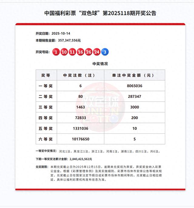 大皖新闻讯10月14日,中国福利彩票“双色球”第2025118期中奖号码公布。当期开出6注一等奖,单注中奖金额8065036元。