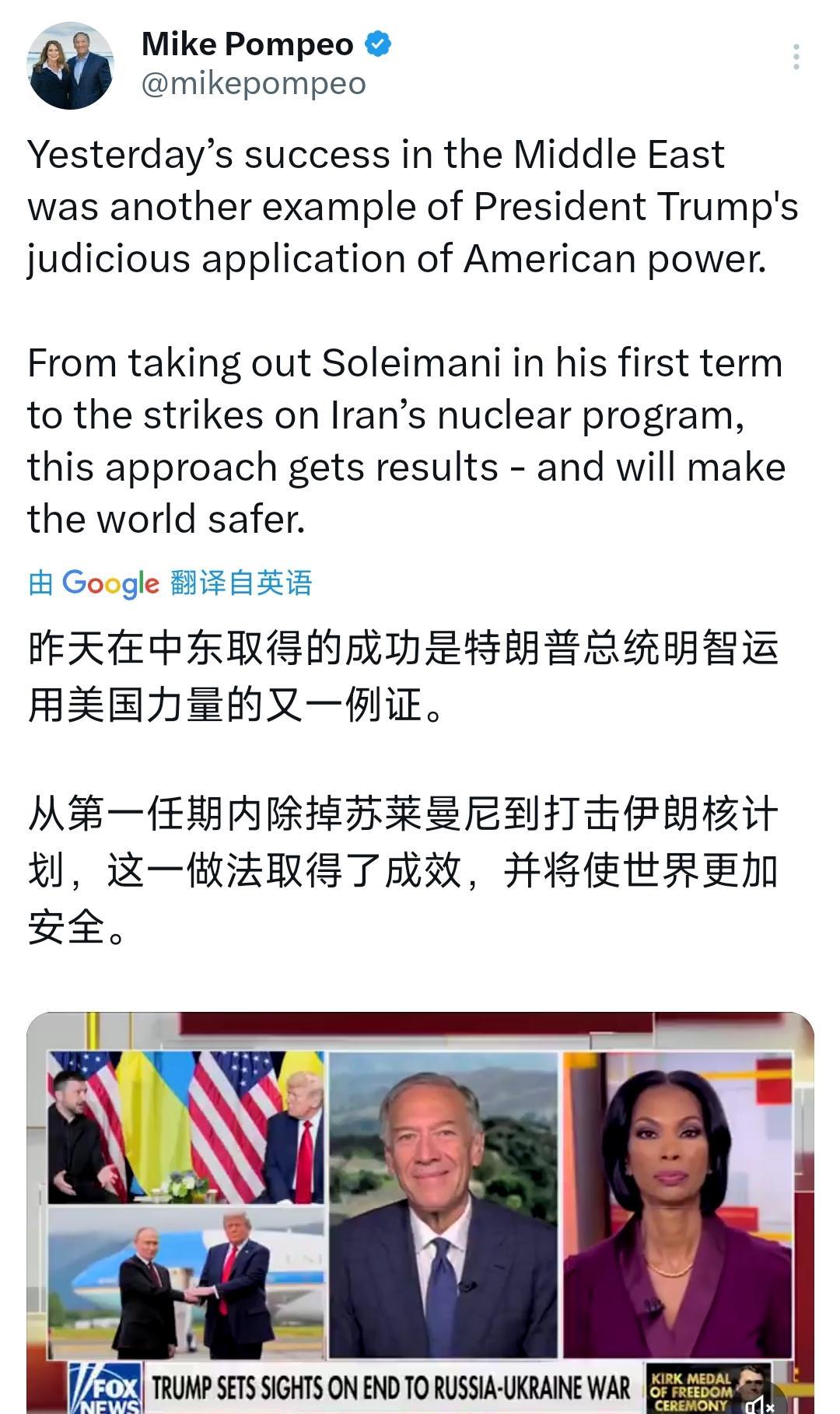 美国前国务卿蓬佩奥今天(北京时间10月15日)表示:“昨天在中东取得的成功是特朗普总统明智运用美国力量的又一例证。从第一任期内除掉苏莱曼尼到打击伊朗核计划,这一做法取得了成效,并将使世界更加安全。” [机智]评几句:蓬佩奥的马屁拍得实在谄媚,却难掩其政治投机本质。特朗普向来睚眦必报,过去两年蓬佩奥多次背刺,甚至在国会山事件后急于切割,这些“黑历史”特朗普岂会忘记?蓬佩奥将中东成果全归功于特朗普,不过是想借旧主东山再起。可他忘了,特朗普用人向来看重忠诚,像他这种“墙头草”,即便再会吹捧,也难入特朗普重用之列,不过是政治场上的跳梁小丑罢了。