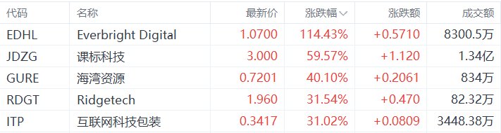 格隆汇10月15日|中概股收盘涨幅前五的个股为:EverbrightDigital涨114.43%,课标科技涨59.57%,海湾资源涨40.1%,Ridgetech涨31.54%,互联网科技包装涨31.02%。(格隆汇)