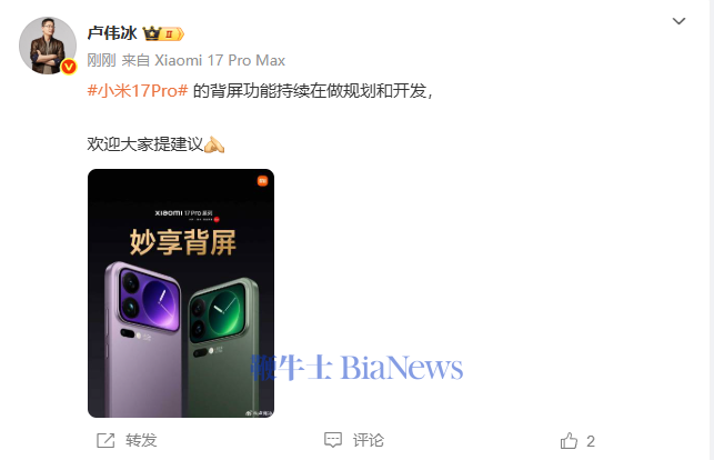 今天,小米集团合伙人、总裁卢伟冰表示,针对小米17Pro背屏的新功能正持续推进规划与开发。