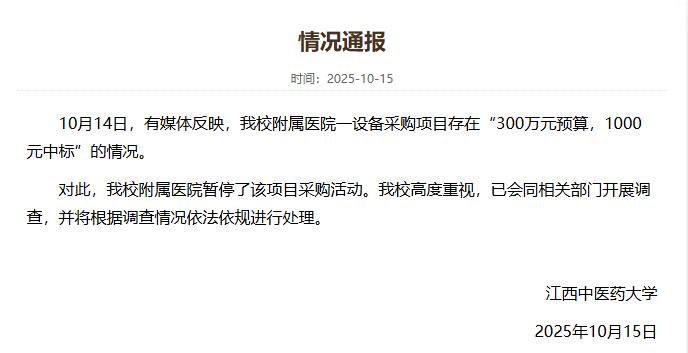 央视网消息:据江西中医药大学网站消息,江西中医药大学发布情况通报:10月14日,有媒体反映,江西中医药大学附属医院一设备采购项目存在“300万元预算,1000元中标”的情况。对此,江西中医药大学附属医院暂停了该项目采购活动。江西中医药大学高度重视,已会同相关部门开展调查,并将根据调查情况依法依规进行处理。