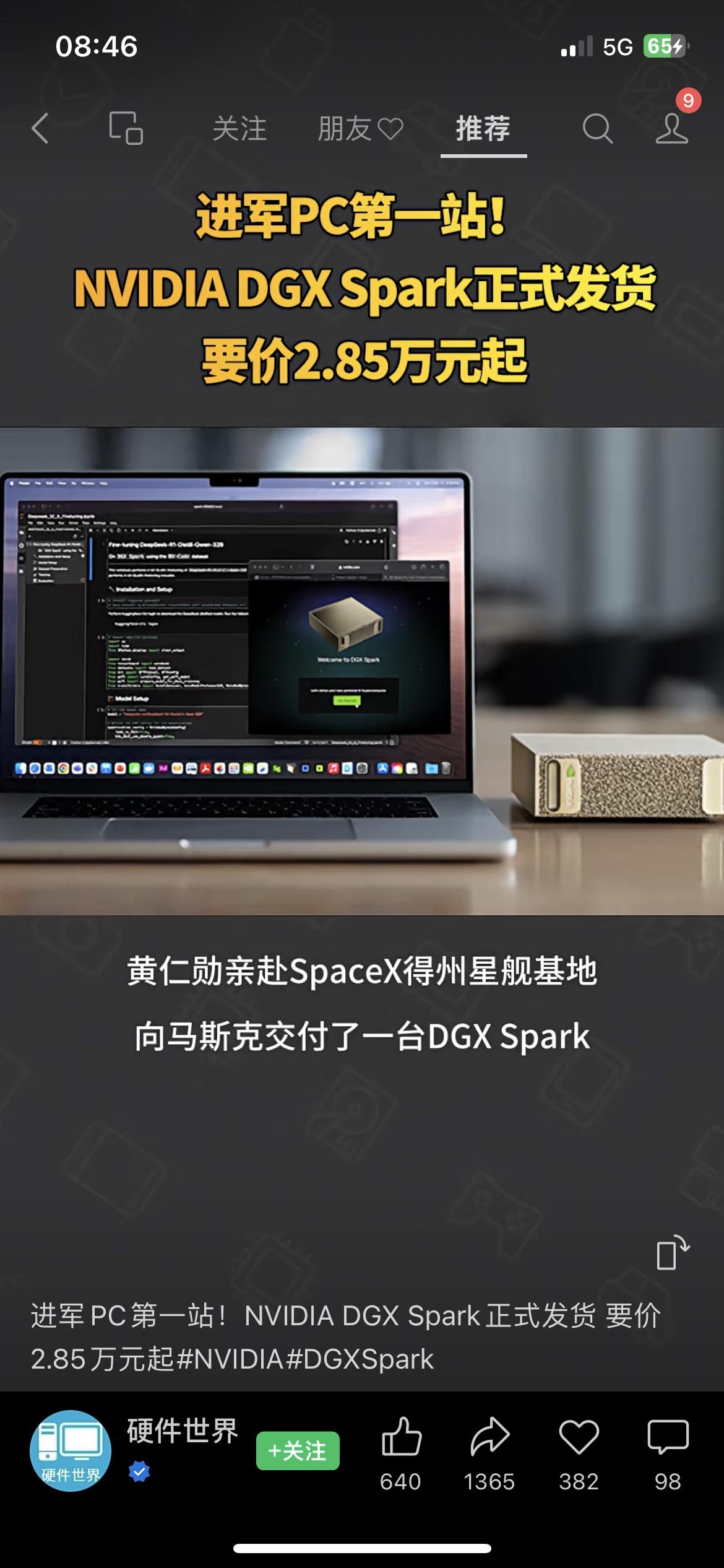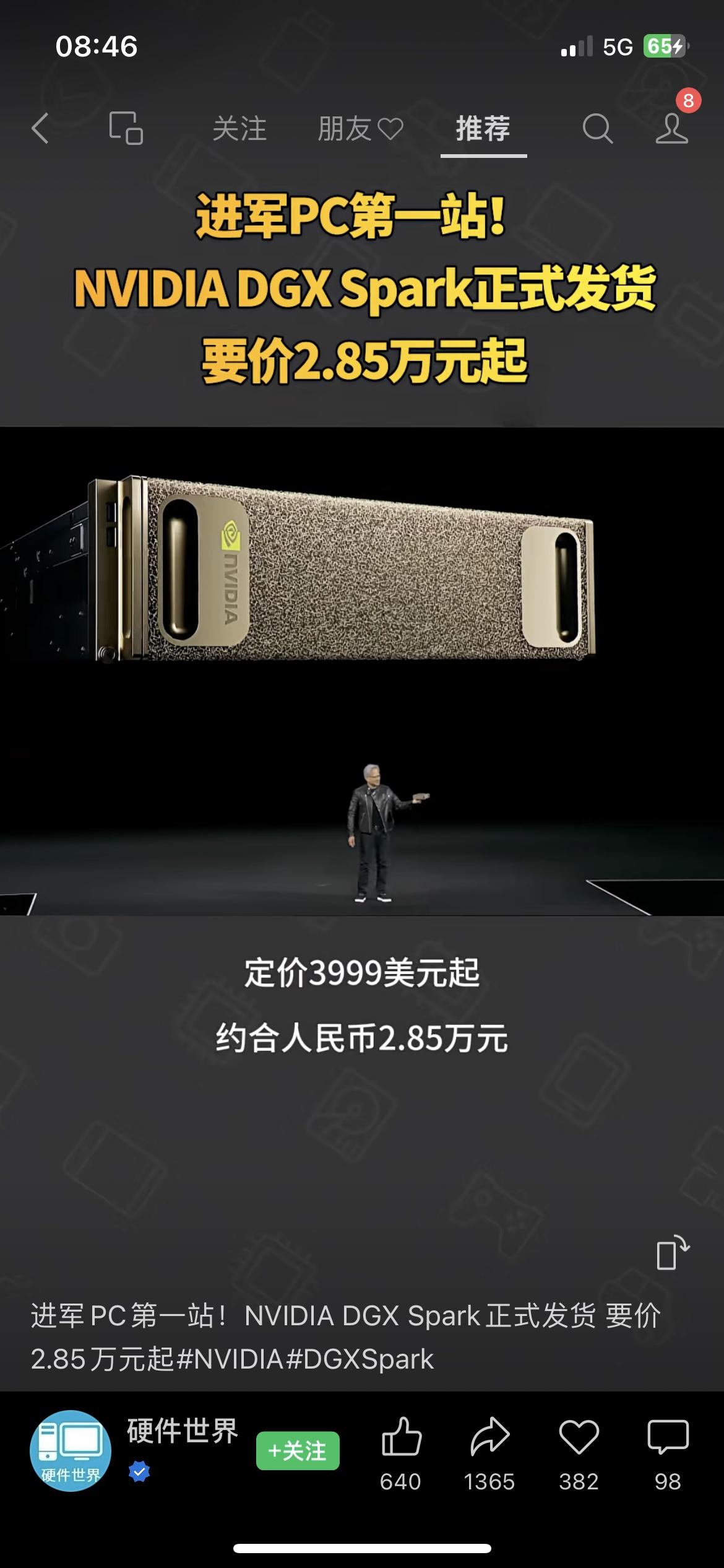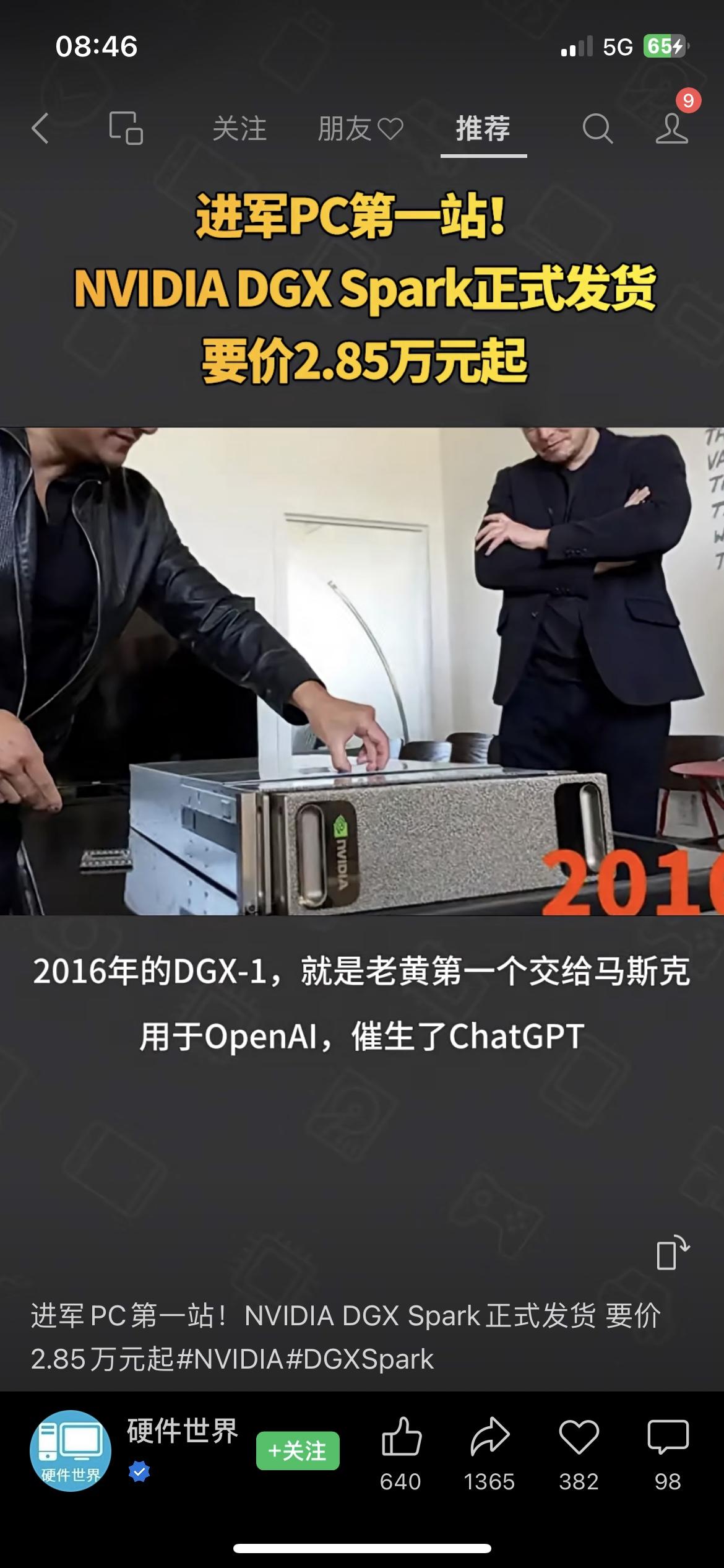 英伟达DGX Spark发货 NVIDIA DGX Spark正式发货,定价2.85万元起 NVIDIA推出的全球最小AI超级计算机DGX Spark正式发货,定价3999美元(约合人民币2.85万元)起。 NVIDIA创始人黄仁勋亲赴SpaceX得州星舰基地,向马斯克交付了一台DGX Spark。早在2016年,NVIDIA的DGX-1就曾助力相关技术研发,对人工智能发展具有一定推动作用。英伟达 AI超算 科技产品英伟达行情 英伟达 英伟达AI
