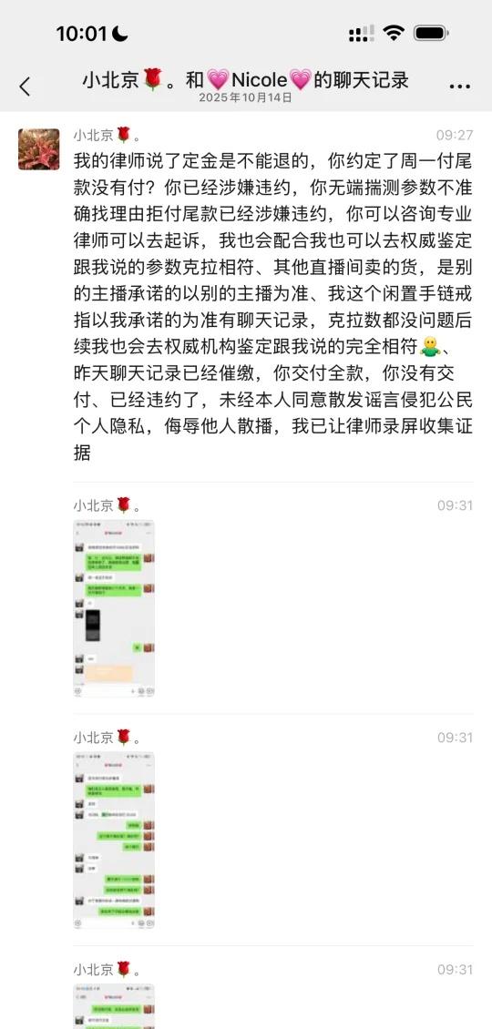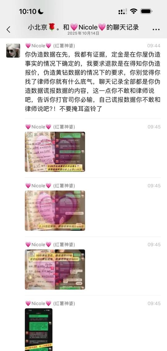 她是不是拿不出钱? 何小姐,你真的问了律师呀?你跟你的律师有没有说清楚你虚报参数啊?你不要骗你的律师哦,骗你的律师你的律师也不能给到准确的回答的。 还有啊,你随时录屏,我也都录屏取证完了,照片由公共平台你自行发布的,我在发布的时候也打了马赛克了,以及我所有的发布内容都是有理有据真实内容,没有一句话是存在伪造。 还有何女士,警察在跟你打电话的所有过程都是有录音证据的,包括警察跟乔家的所有沟通记录,你可以去鉴定和要求调取。那你的意思是乔家@乔家珠宝 @乔家珠宝|乔哥 在伪造数据了?乔家也可以告你的哦,你该不会是5000块都付不出来吧? 实在不行,让你的律师和我的律师通话,别在这装了。 戏真多,一天比一天精彩。我终于理解到有些商家跟我说说不清楚的人是咋样的人了。 翡翠闲置 乔家珠宝 黄钻 闲鱼经历