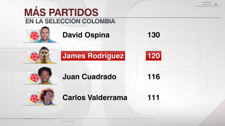 据ESPN统计,此役是J罗为哥伦比亚国家队出战的第120场比赛,队史出场次数仅少于奥斯皮纳。