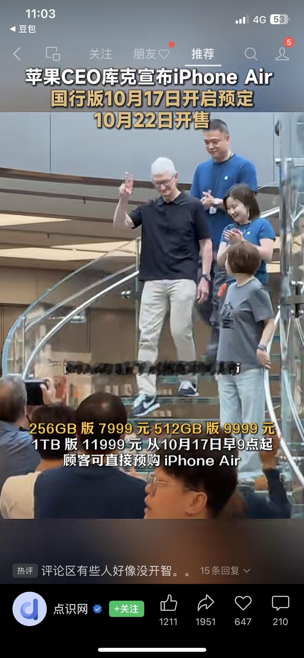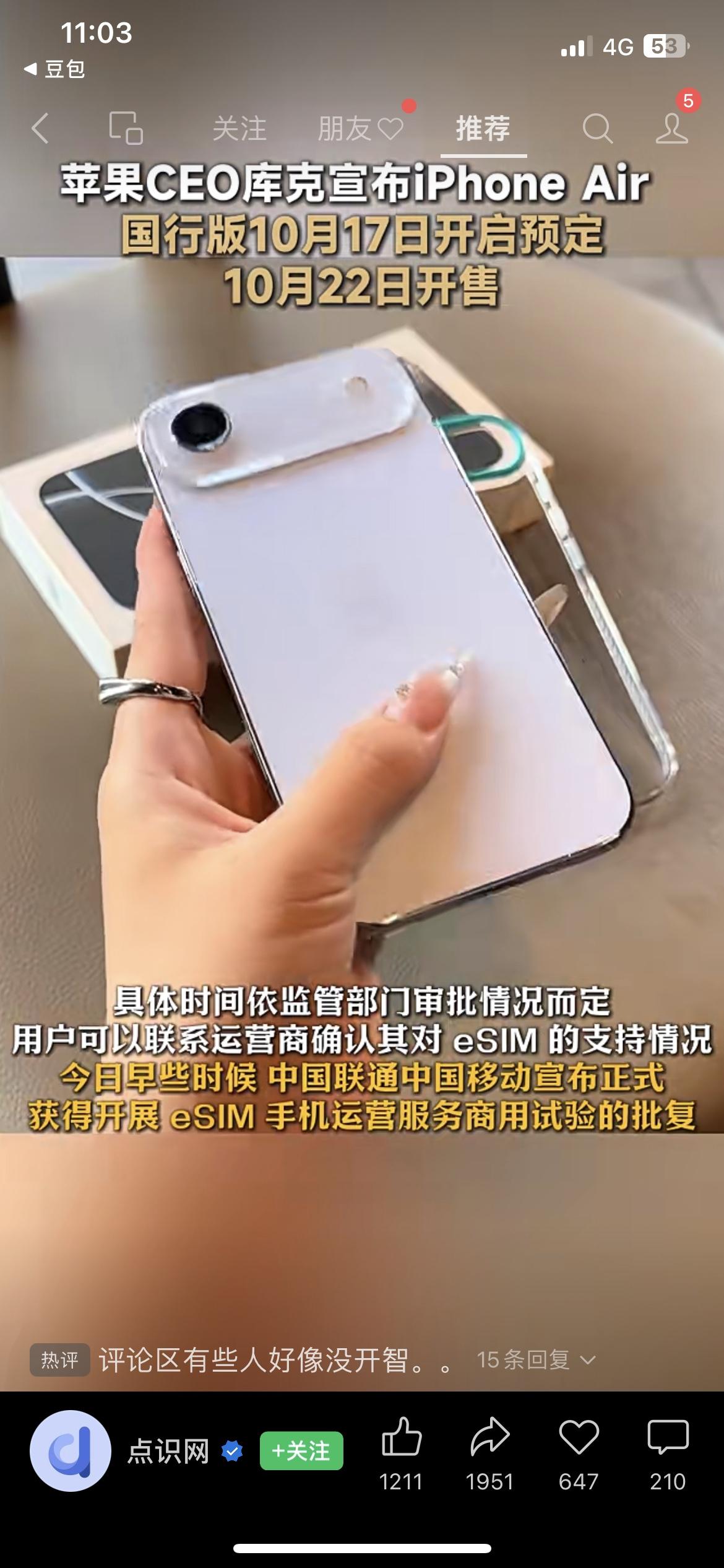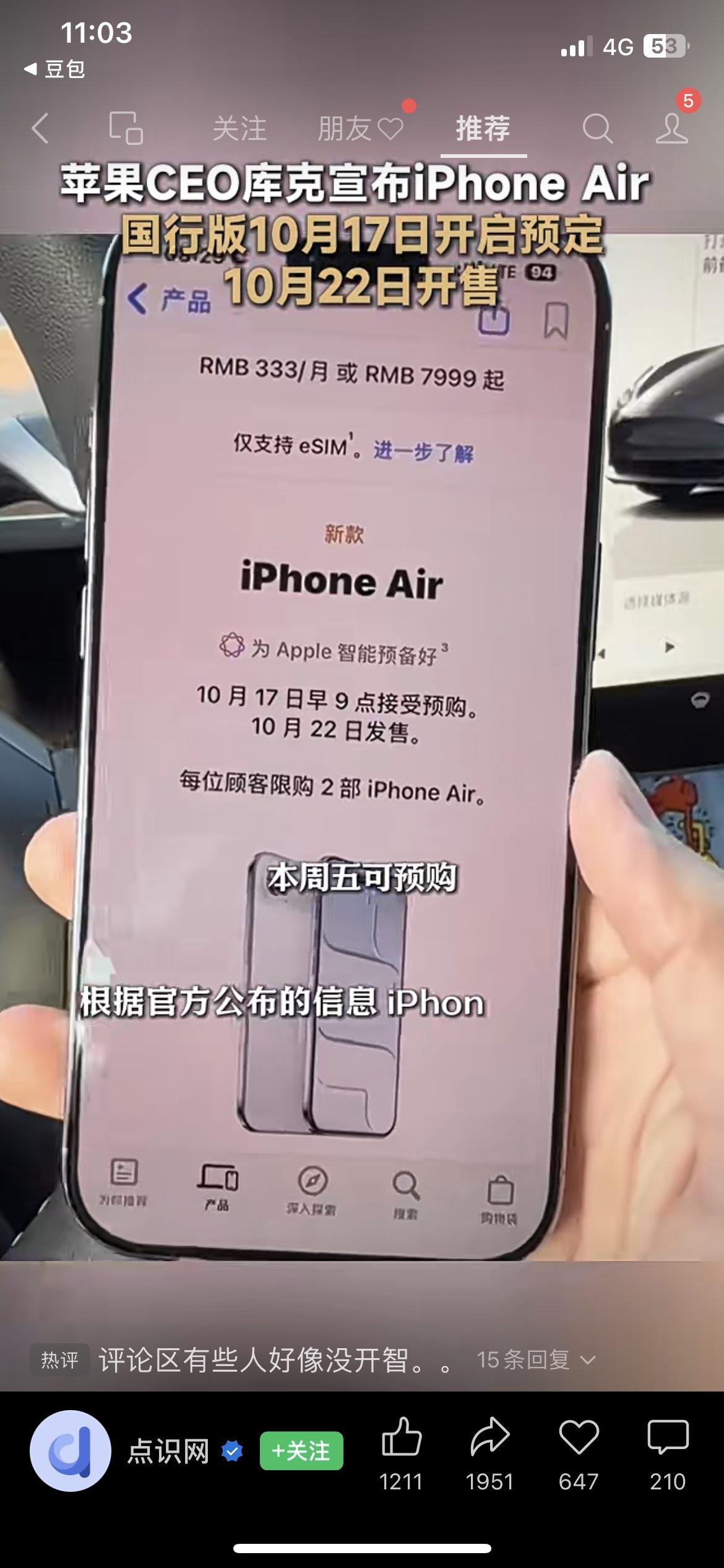 库克突袭官宣!iPhone Air本周五开抢,7999起还没卡槽? 苹果CEO库克亲自下场官宣:iPhone Air国行版10月17日(本周五)早9点开启预购,22日正式发售!256GB版7999元、512GB版9999元、1TB版11999元,关键是这手机只支持eSIM,没有物理卡槽! 三大运营商已经全员支持eSIM了,苹果这波无卡新机+高价操作,你们是冲苹果还是等华为的eSIM手机? iPhoneAir 苹果新机 eSIM无卡时代苹果新机型价格 国行esim