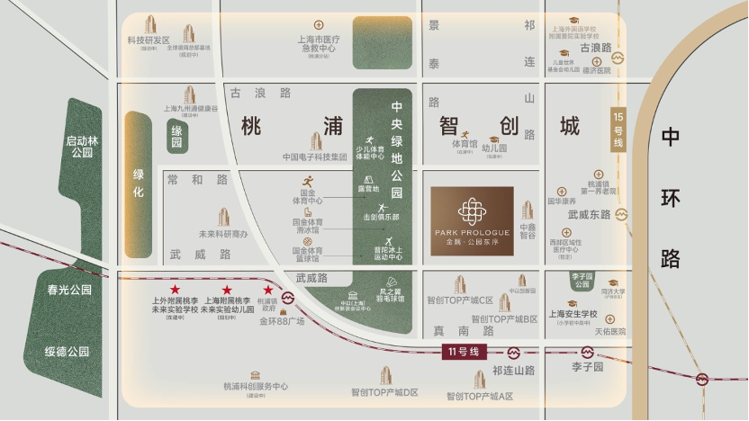 四轨交通路网在此聚集连接(11号线祁连山路站、15号线古浪路站、20号线(规划中)、26号线(规划中)),可直连真如、静安寺、环球港、徐家汇等各大CBD和商圈。