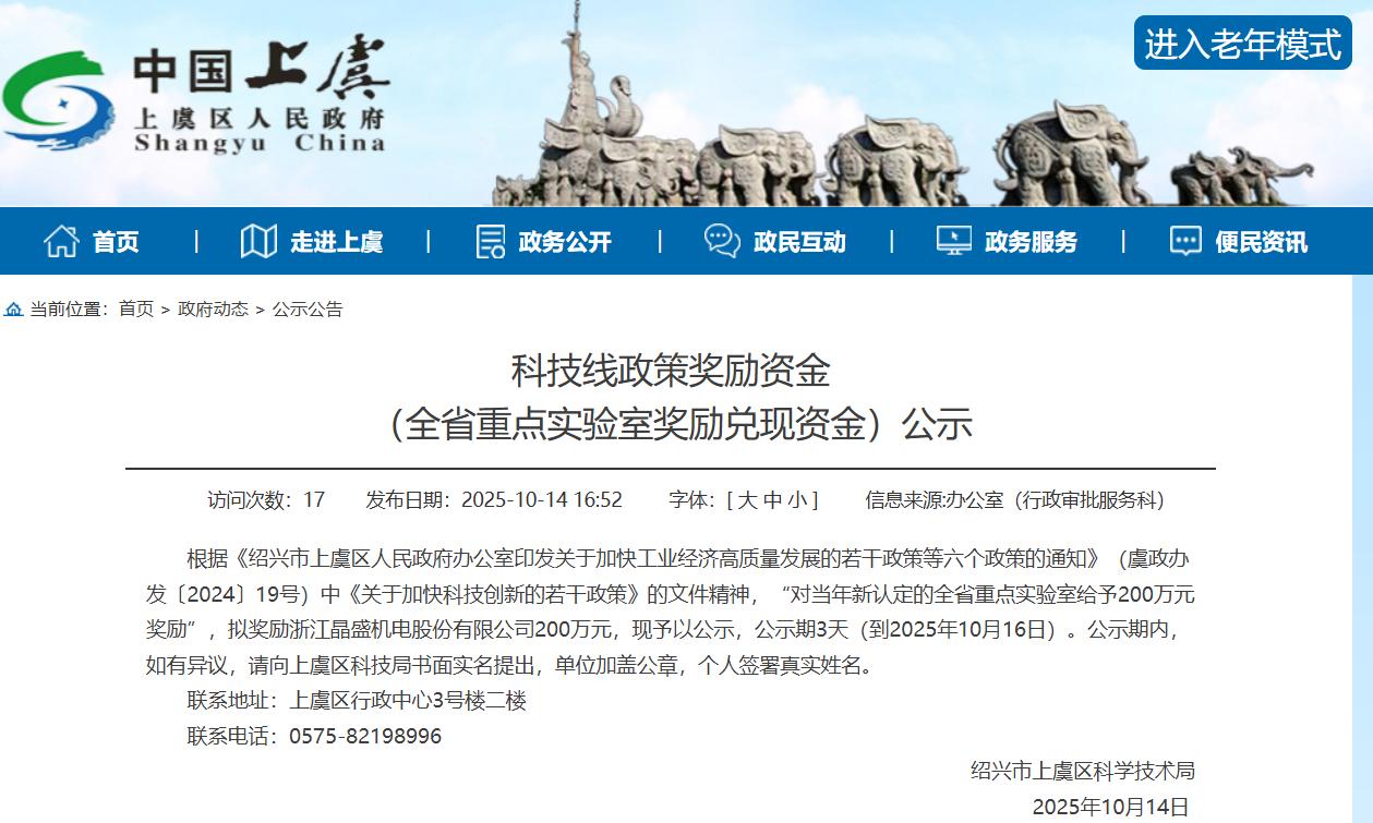 根据《绍兴市上虞区人民政府办公室印发关于加快工业经济高质量发展的若干政策等六个政策的通知》(虞政办发〔2024〕19号)中《关于加快科技创新的若干政策》的文件精神,“对当年新认定的全省重点实验室给予200万元奖励”,拟奖励浙江晶盛机电股份有限公司200万元,现予以公示,公示期3天(到2025年10月16日)。公示期内,如有异议,请向上虞区科技局书面实名提出,单位加盖公章,个人签署真实姓名。