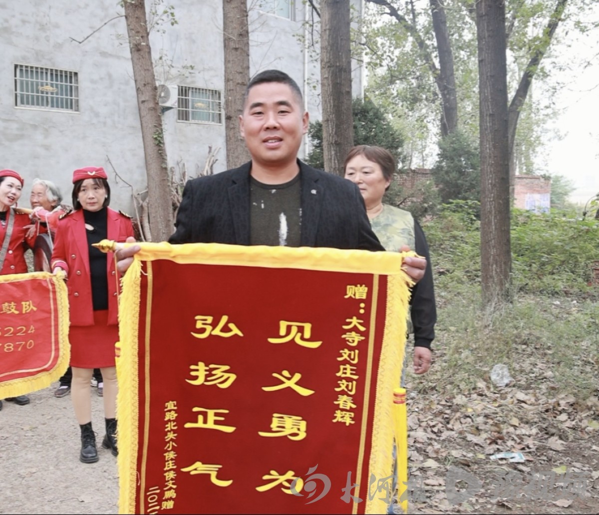 “咦,那天可热闹,敲锣打鼓的礼乐队都来了,还以为谁家办喜事,最后才知道是感谢俺村的好人刘春辉哩。”10月15日,郸城县宜路镇大寺刘庄村村民们谈及刘春辉救人的事,仍在交口称赞。不久前的10月9日,路遇一对落水母子遇到危险的刘春辉,跳入胸口深的冰冷深水中,成功救起母子二人。事后,获救的村民雇了个礼乐队,把锦旗送到刘春辉所在的村里。