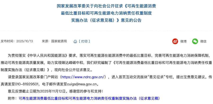 10月13日,国家发展改革委发布《可再生能源消费最低比重目标和可再生能源电力消纳责任权重制度实施办法(征求意见稿)》(以下简称“征求意见稿”)。征求意见稿共五章二十五条,明确重点用能行业及省级区域的可再生能源消费最低比重与电力消纳责任。通过绿证交易、自发自用、绿电直连等方式落实目标,强化监测考核,未完成者将面临约谈、通报等处理,以系统性机制推动能源结构绿色转型。