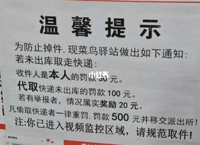 网友发布的照片显示,一则“温馨提示”写明:为防止掉件,若未出库取走快递,对收件人本人罚款30元,代取未出库罚款100元,举报属实者可获奖20元。