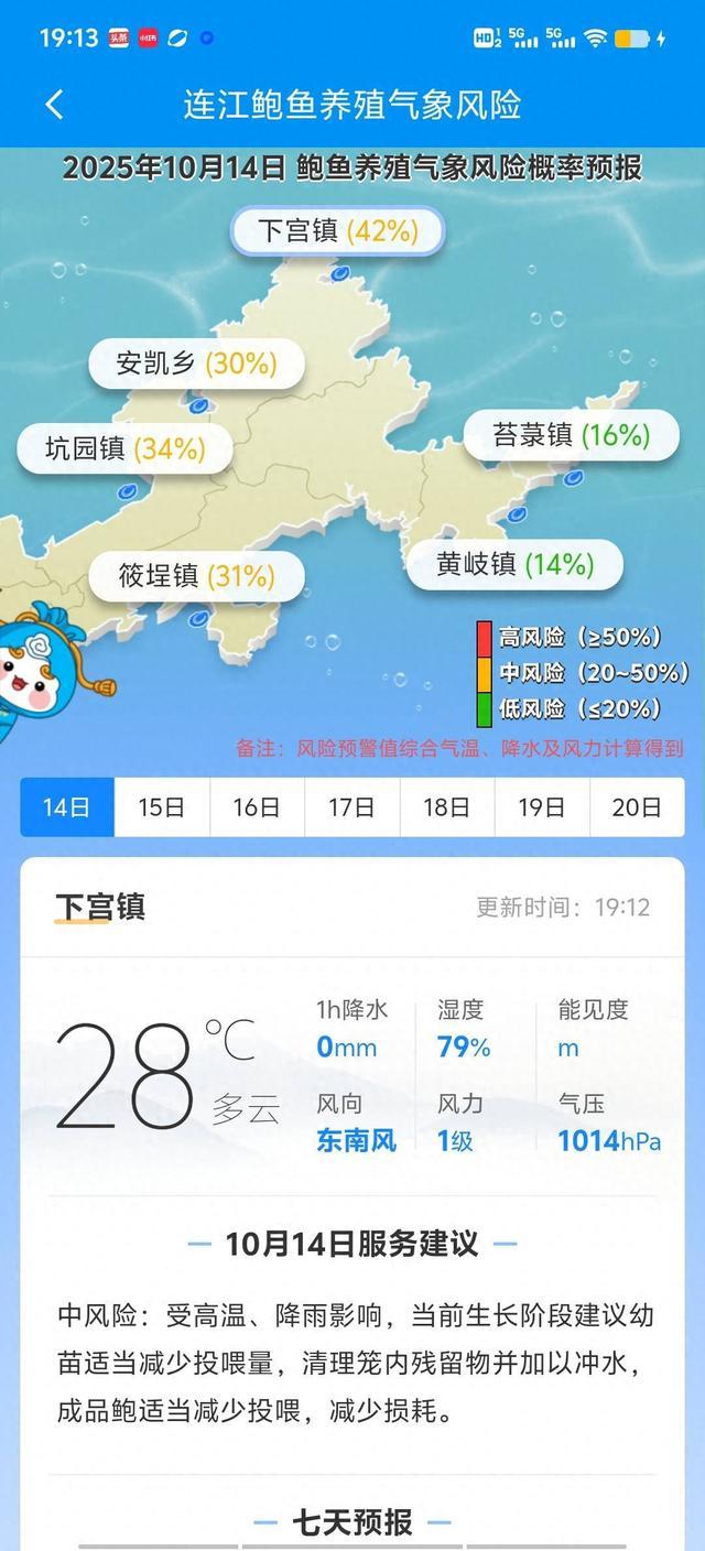 目前,养殖户只需打开“知天气”APP,进入福州服务专区“海连江”模块,定位或选择所在乡镇,即可获取未来一周的鲍鱼养殖气象风险预报及服务建议,从而合理安排投饵、收获、设施加固等生产活动,有效降低生产风险。以下宫镇为例,页面显示10月14日为中风险,受高温、降雨影响,当前生长阶段建议幼苗适当减少投喂量,清理残留物并加以冲水,成品鲍适当减少投喂,以减少损耗。